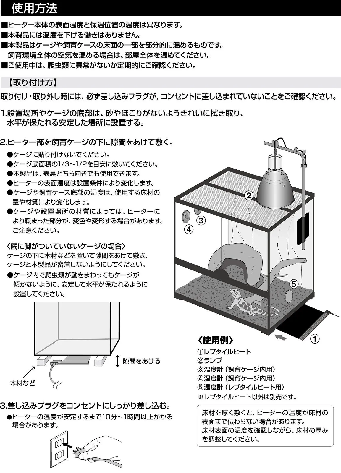 補助ヒーターとして、ケージの下に敷いてご使用ください。ガラスケージの下に敷いて、ケージとレプタイルヒートとの間に隙間をあけてご使用ください。また、ケージの底面積1/3~1/2を目安に設置してください。※ケージに貼り付けて使用しないでください。※ケージの外に設置してください。ケージ内への設置はしないでください。 <使用上の注意>