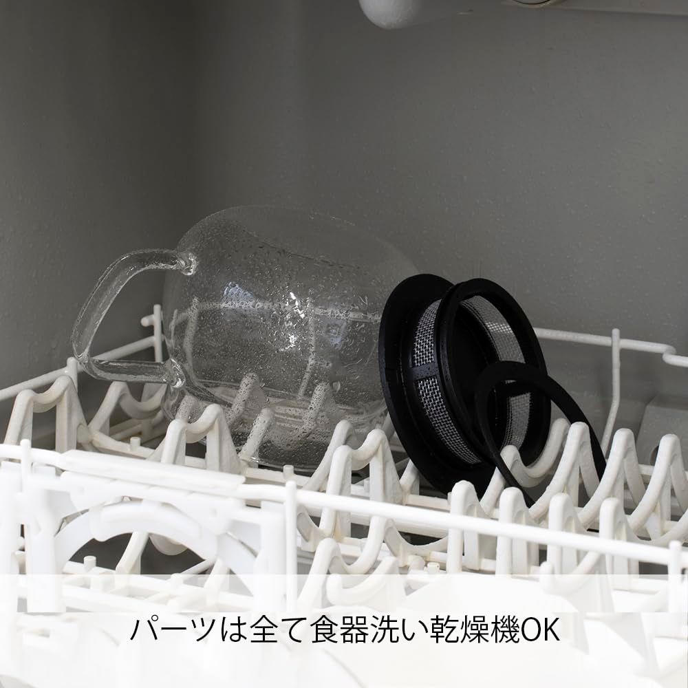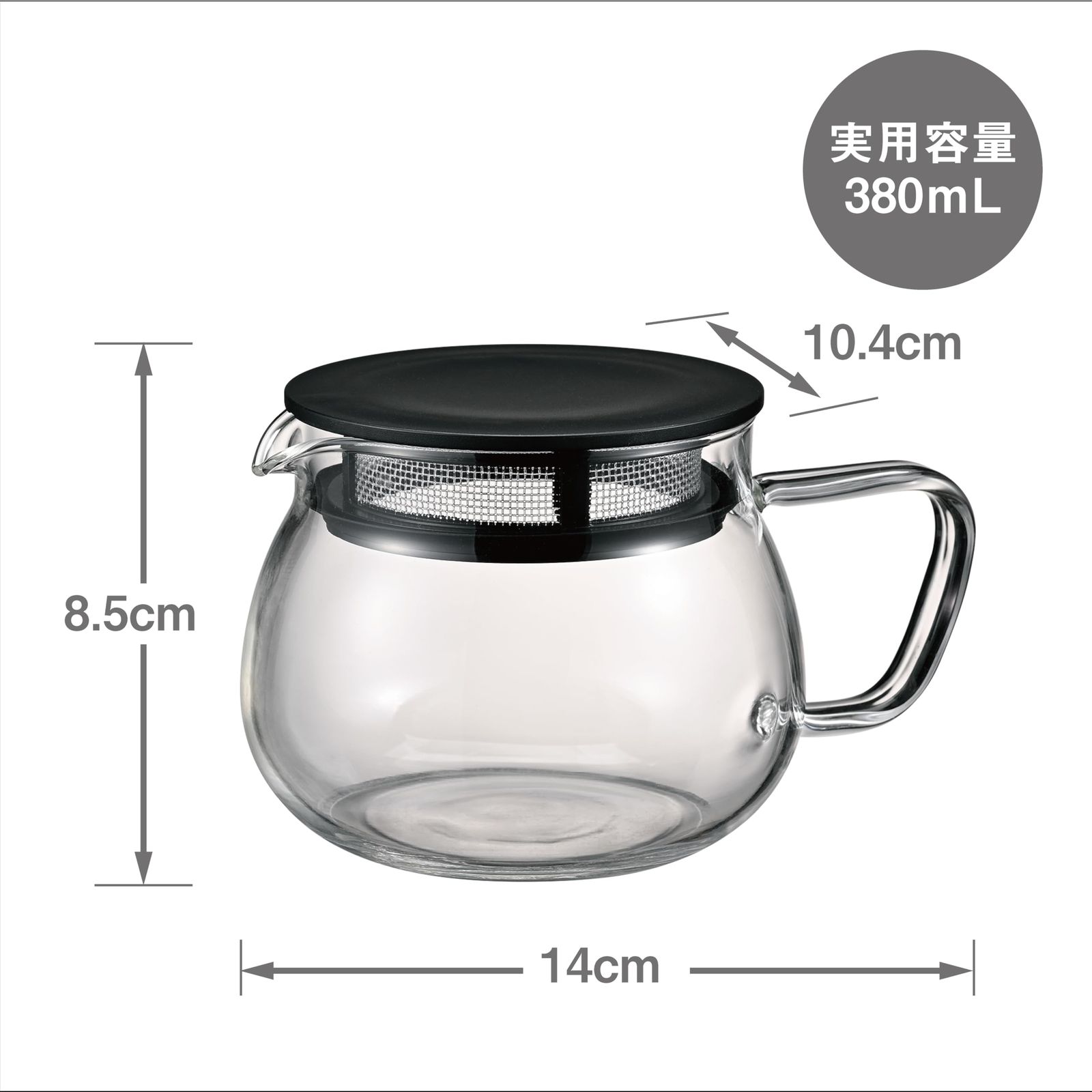 【商品詳細】本体サイズ:幅14.0×奥行10.4×高さ8.5cm、本体重量約165g、実用容量:380mL、本体材質:本体/耐熱ガラス、フタ・フィルター/ポリプロピレン、パッキン/シリコーンゴム、日本製