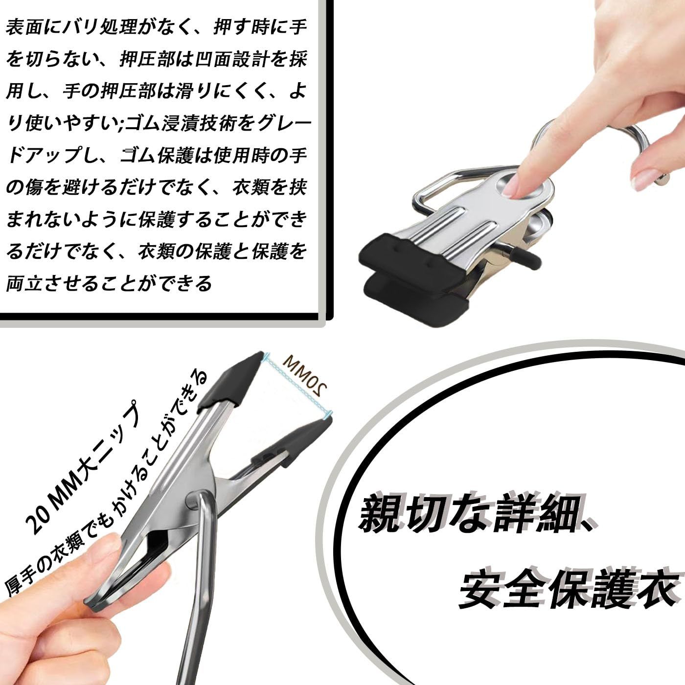 親切な詳細、安全保護衣:表面にバリ処理がなく、押す時に手を切らない、押圧部は凹面設計を採用し、手の押圧部は滑りにくく、より使いやすい;ゴム浸漬技術をグレードアップし、ゴム保護は使用時の手の傷を避けるだけでなく、衣類を挟まれないように保護することができるだけでなく、衣類の保護と保護を両立させることができる