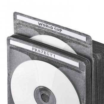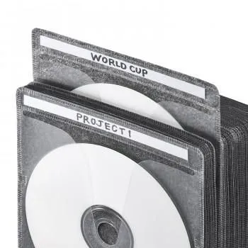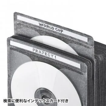保管に便利な収納ケース付きで最大50枚のディスクを収納することができます。(付属不織布ケースに両面収納時)片面にジャケットカード、もう片面にディスクを収納することもできます。不織布にはディスクを出し入れしやすい切れ込みと、飛び出しを防ぐサイドストッパーが付いています。ディスク接触面はレーベルインクが貼り付きにくいシボ加工となっています。検索に便利な自由に書き込めるインデックスカードを付属しています。