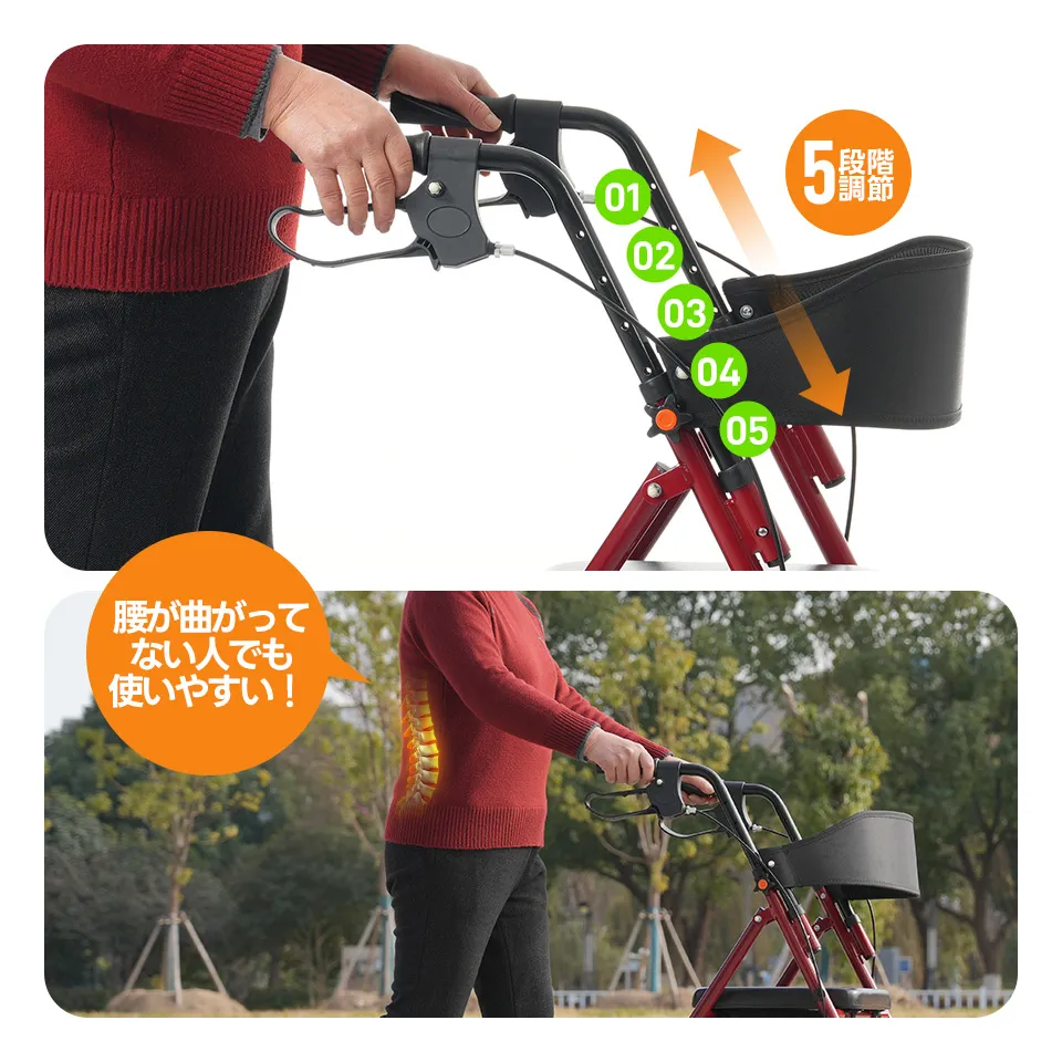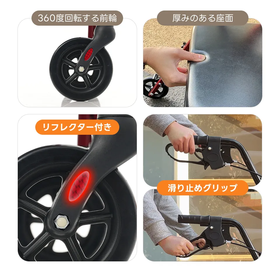◎02歩行補助快適な歩行をサポート!四輪を採用しており、安定性が向上し、長時間のお出かけも安心します。歩行時の負担を軽減し、健康的な生活をサポートします。