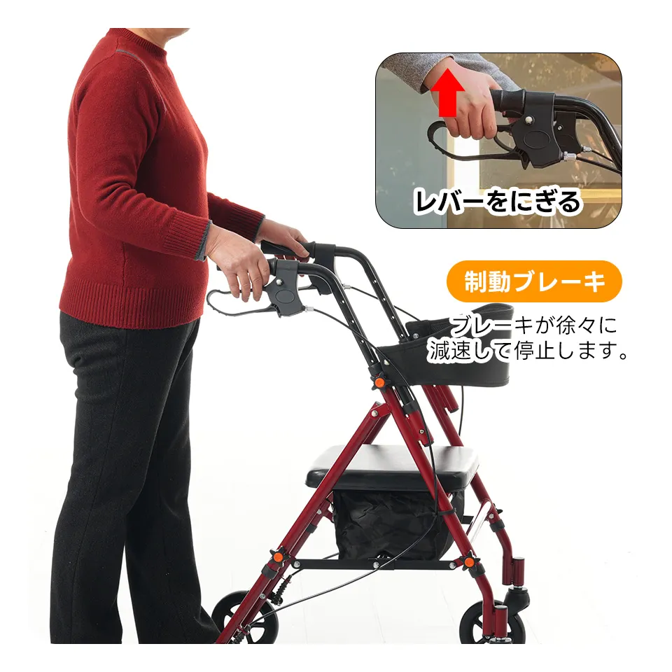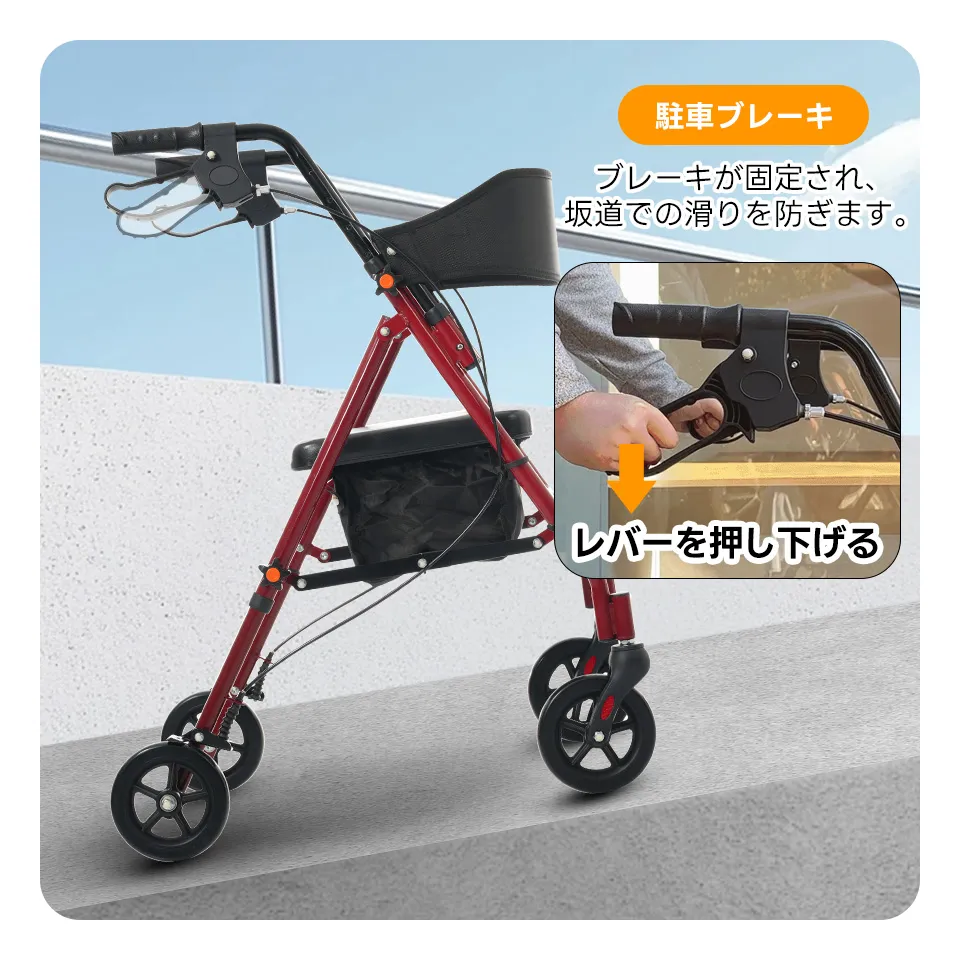 四輪を採用しており、安定性が向上し、長時間のお出かけも安心します。歩行時の負担を軽減し、健康的な生活をサポートします。