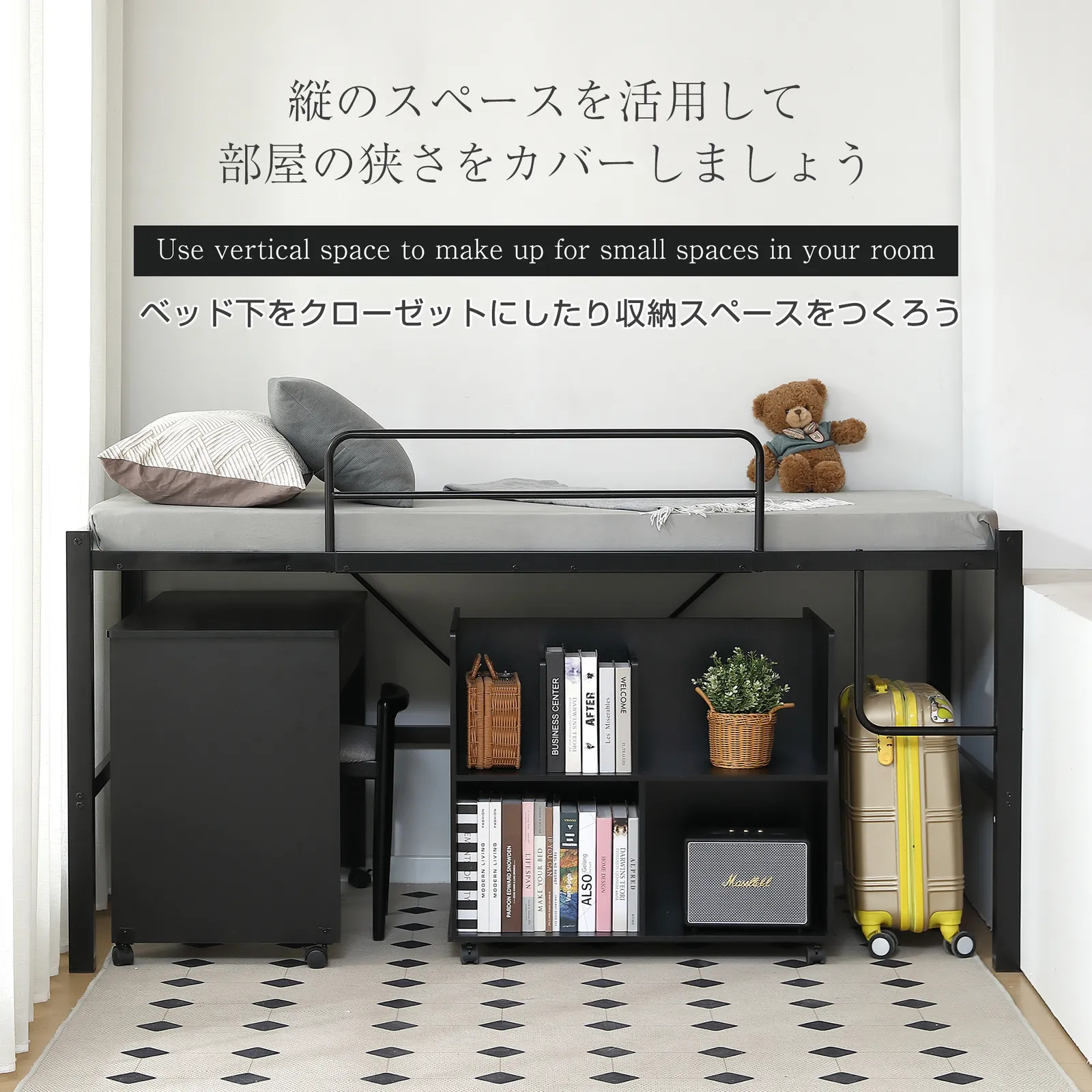 縦のスペースを活用して部屋の狭さをカバーしましょうベッド下をクローゼットにしたり収納スペースをつくろう