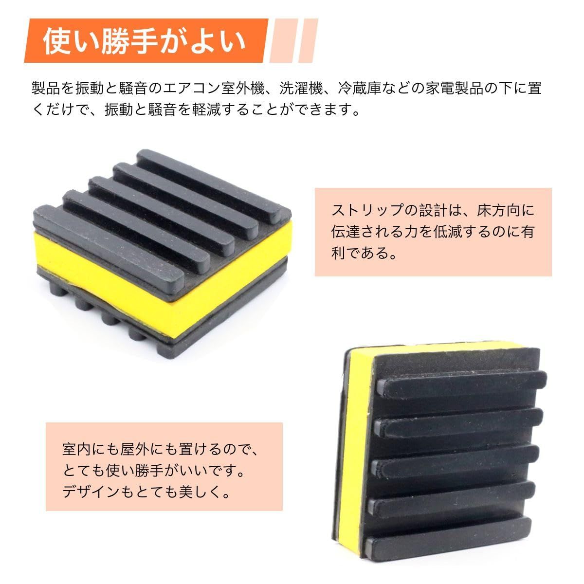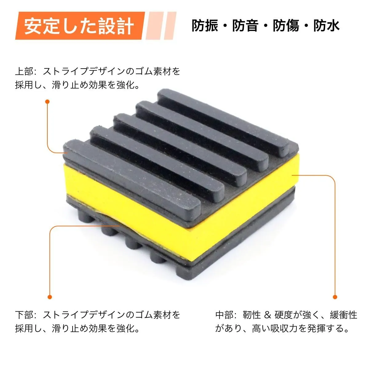 防振ゴムマットは、洗濯機、室外機、3Dプリンターなどの家具や家電に簡単に設置できる便利な防音・防振パッドです。サイズは7.6×7.6cm、厚み2.3cmで、手のひらサイズの軽量設計。持ち運びや設置も簡単に行えます。 この防振マットは、一般的なジョイントマットよりも硬度が高く、重たい家電や家具をしっかりと支えます。独自の溝デザインが滑り止め効果を高め、振動エネルギーを効率的に分散して騒音や振動を抑えます。 また、耐久性のあるゴム素材を採用しており、衝撃吸収力に優れ、水や熱にも強い特徴を持っています。さらに、色移りしにくい設計で、長期間にわたって安心して使用できます。4個セットで、水平な場所に設置してぐらつきがないか確認しながら使用することで、安全で効果的な防振・防音対策が可能です。日常の生活音を軽減し、より快適な環境を提供します。