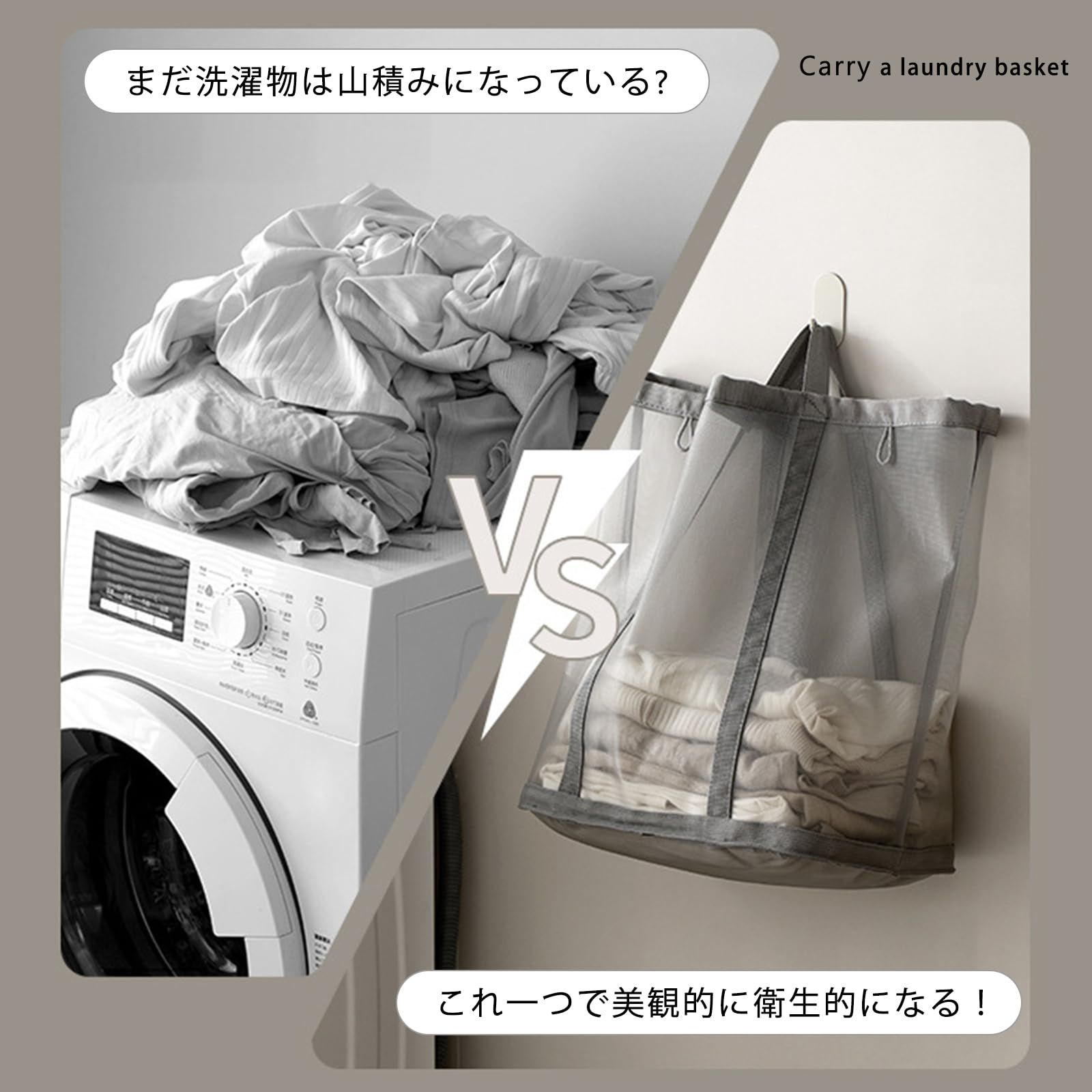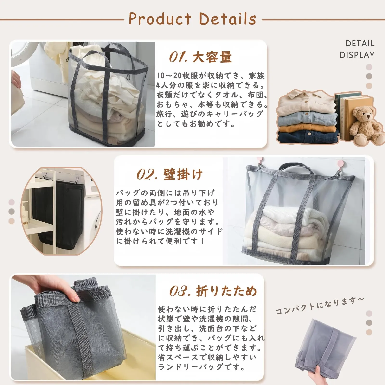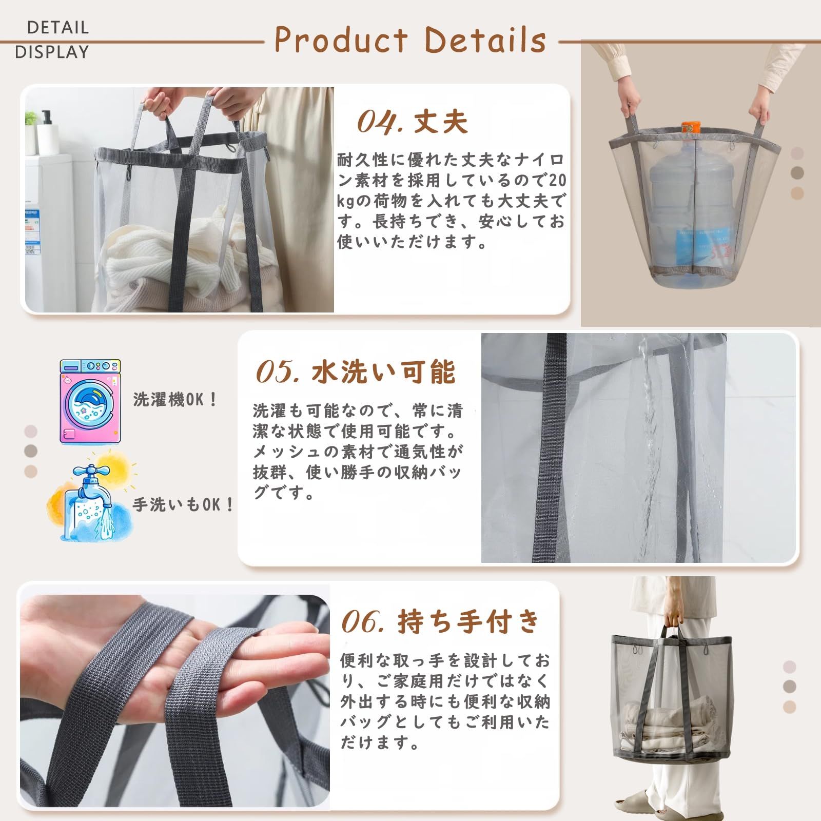 【折り畳め・省スペース】:ランドリーバッグの重量は120gで、超軽量で普段使いに楽です。使わない時に折りたたんだ状態で壁や洗濯機の隙間、引き出し、洗面台の下などに収納でき、バッグやスーツケースにも入れて持ち運ぶことができます。省スペースで収納しやすいランドリーバッグです。