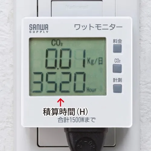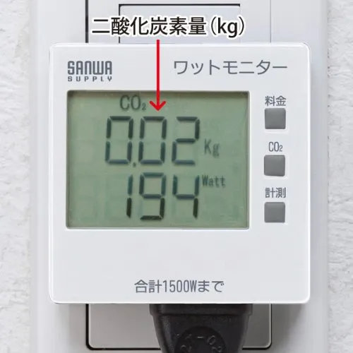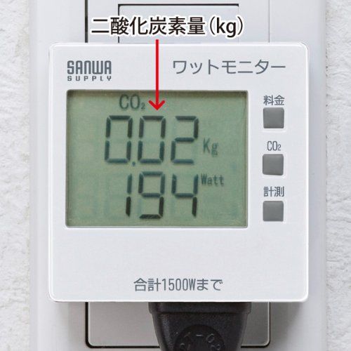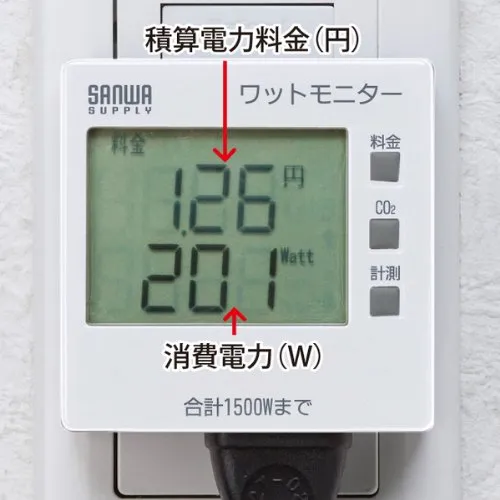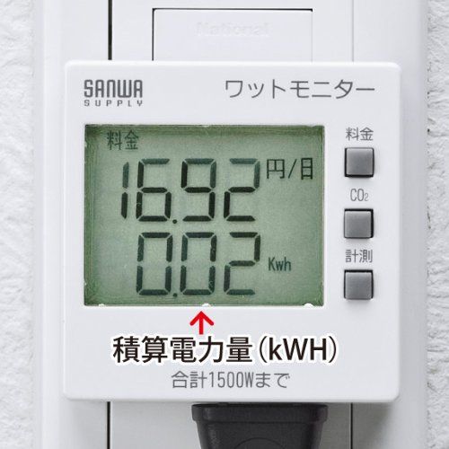 消費電力(W)、積算電力量(KWH)、積算時間(H)、積算電力料金、二酸化炭素量の5種類が測定できます。