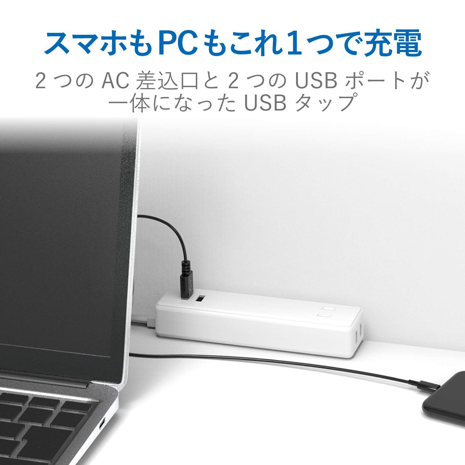 2つのAC差込口と2つのUSBポートが一体になったモバイルUSBタップです。