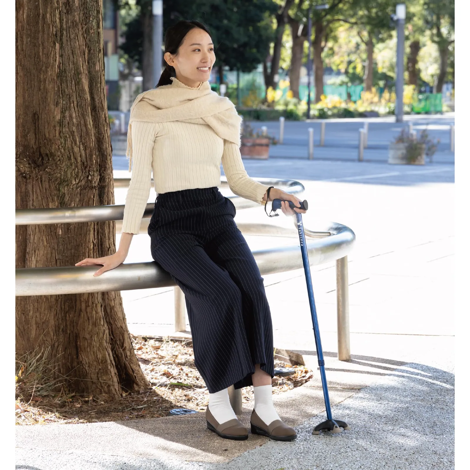 ねばりある杖先がしっかり地面を捉える多点杖。