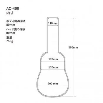 サイズ全長:580mm、ネック幅:110mm、ボディ上部幅:170mm、ボディくびれ部幅:170mm、ボディ下部幅:200mm、ボディ側の深さ:80mm、ヘッド側の深さ:80mm