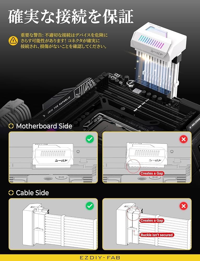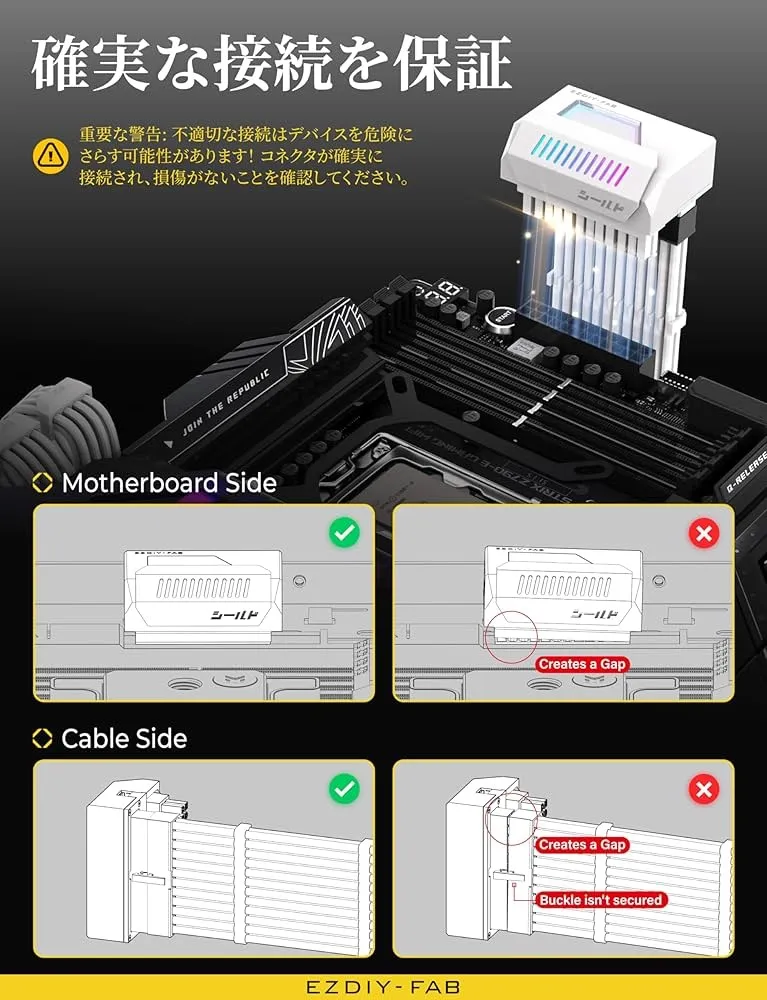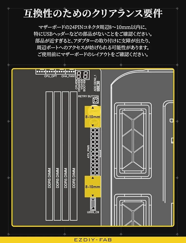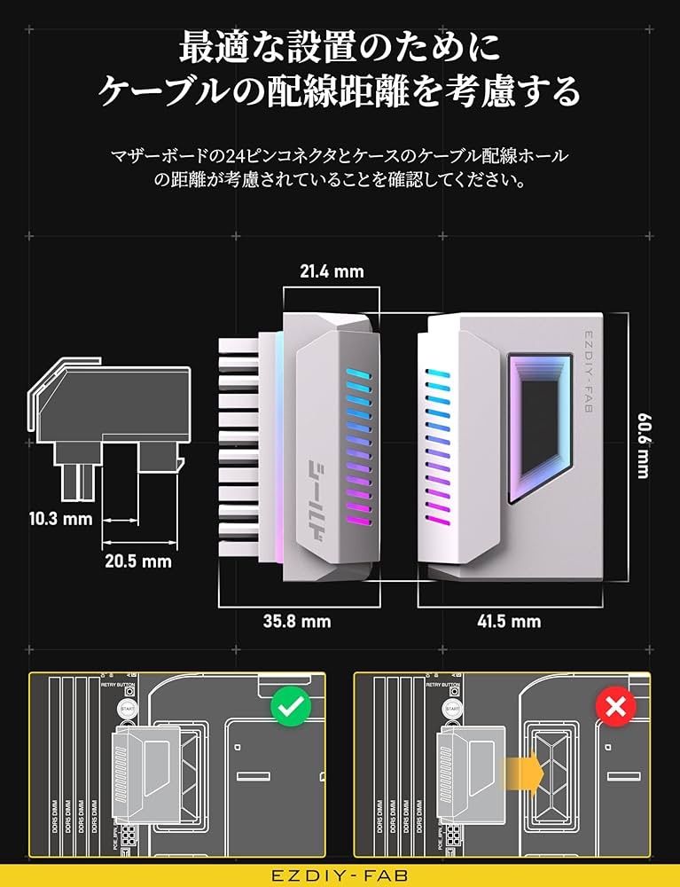 購入前にクリアランスを確認してください:購入の際は、マザーボードの24ピンコネクタとPCケースの配線用ホールとの間に十分なスペースがあるか確認し、設置の干渉を避けてください。付属の寸法情報を使用して、配線がスムーズに行えるように確認してください。