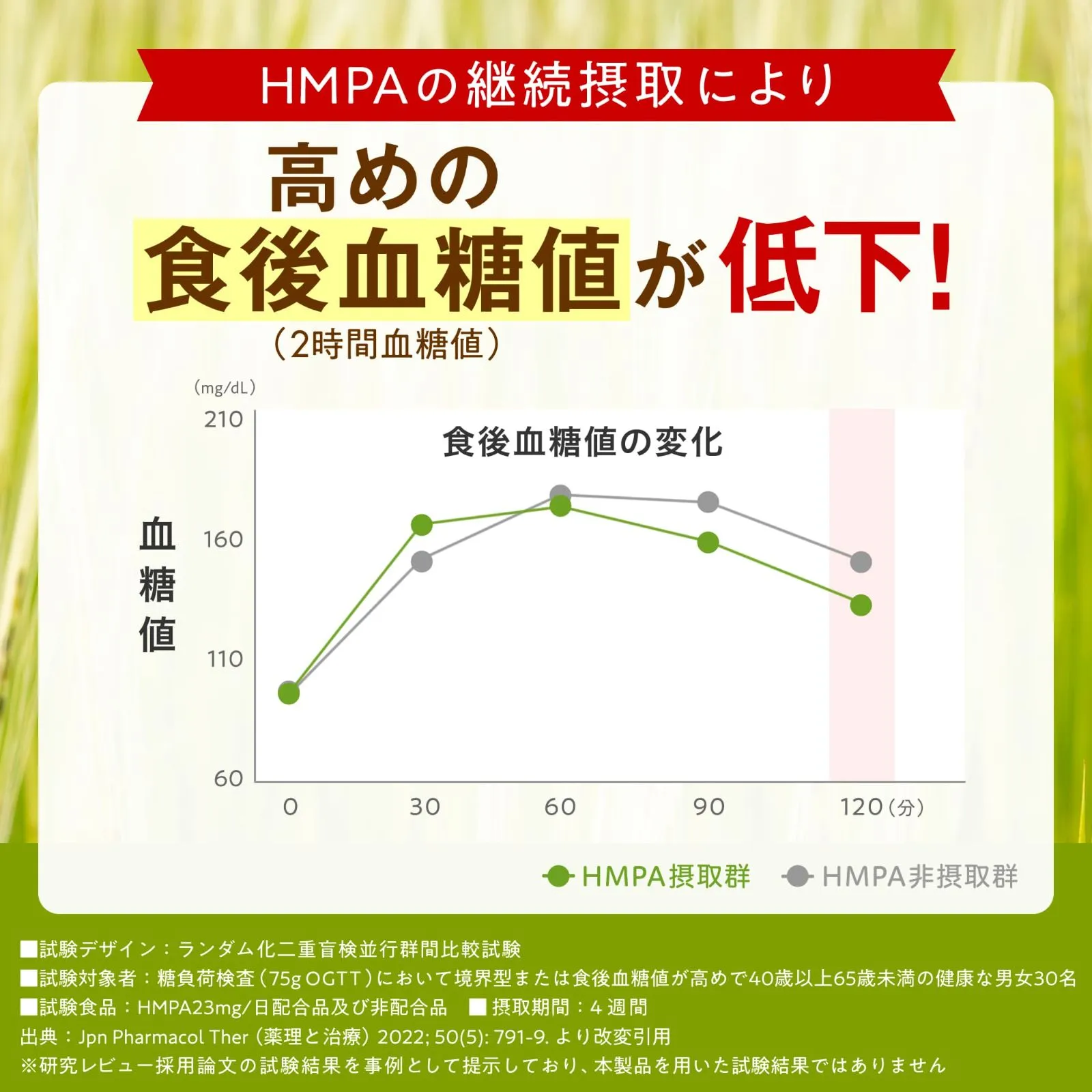 【機能性表示】本品には3-(4-ヒドロキシ-3-メトキシフェニル)プロピオン酸(HMPA)、GABAが含まれます。HMPAは、BMIが高めの方の腹部の脂肪(内臓脂肪、腹部総脂肪)とウエスト周囲径を減らす機能、継続摂取により、食後血糖値が高めの方の食後血糖値(2時間血糖値)を下げる機能、LDLコレステロールが高めの方のLDLコレステロールや総コレステロールを下げる機能が報告されています。GABAには血圧が高めの方の血圧を下げる機能、仕事や勉強による一時的な精神的ストレスや疲労感を緩和する機能、睡眠の質(眠りの深さ、すっきりとした目覚め)の改善に役立つ機能があることが報告されています。
