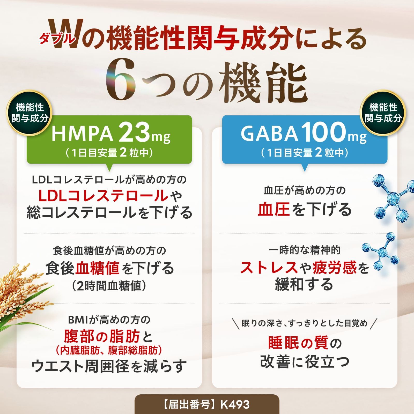 【機能性表示】本品には3-(4-ヒドロキシ-3-メトキシフェニル)プロピオン酸(HMPA)、GABAが含まれます。HMPAは、BMIが高めの方の腹部の脂肪(内臓脂肪、腹部総脂肪)とウエスト周囲径を減らす機能、継続摂取により、食後血糖値が高めの方の食後血糖値(2時間血糖値)を下げる機能、LDLコレステロールが高めの方のLDLコレステロールや総コレステロールを下げる機能が報告されています。GABAには血圧が高めの方の血圧を下げる機能、仕事や勉強による一時的な精神的ストレスや疲労感を緩和する機能、睡眠の質(眠りの深さ、すっきりとした目覚め)の改善に役立つ機能があることが報告されています。