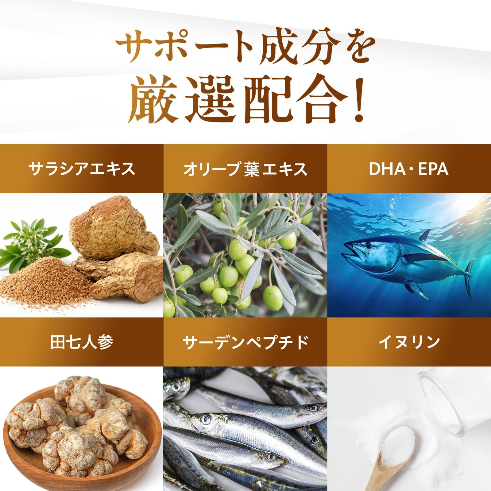 「サラシア」「田七人参」「サーデンペプチド」「イヌリン」「オリーブエキス」「DHA・EPA」