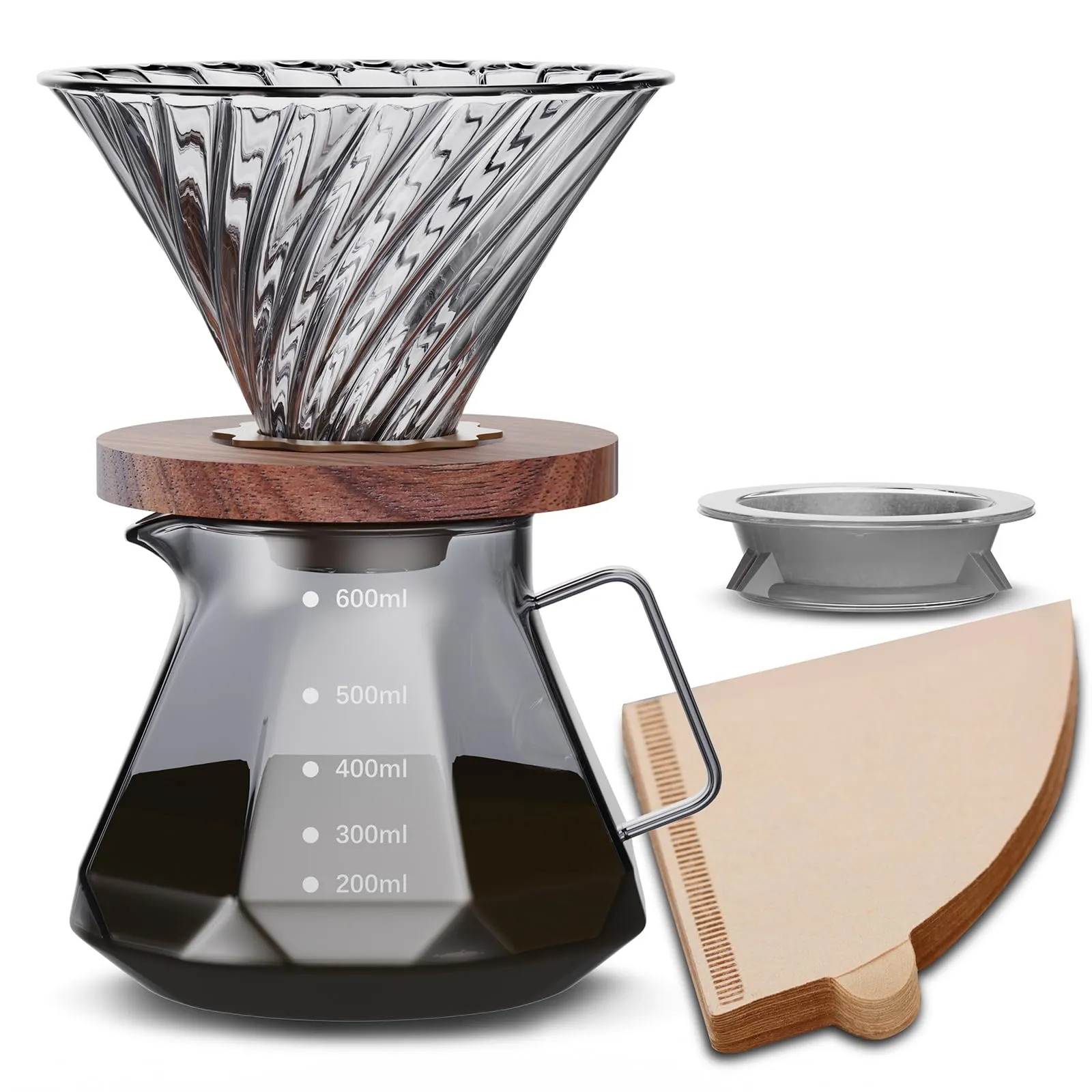 【完璧な組み合わせ】: この コーヒードリップセット は耐熱ガラス、クルミ材、シリコンで構成されています。 パッケージ内容: 1× コーヒードリッパー 、1× 600 ml コーヒーサーバー 、40× V60 コーヒーフィルター。 これは、手動 コーヒー を作りたいというニーズに完全に応えます。 手動 コーヒーの楽しさを体験するのにも最適です。