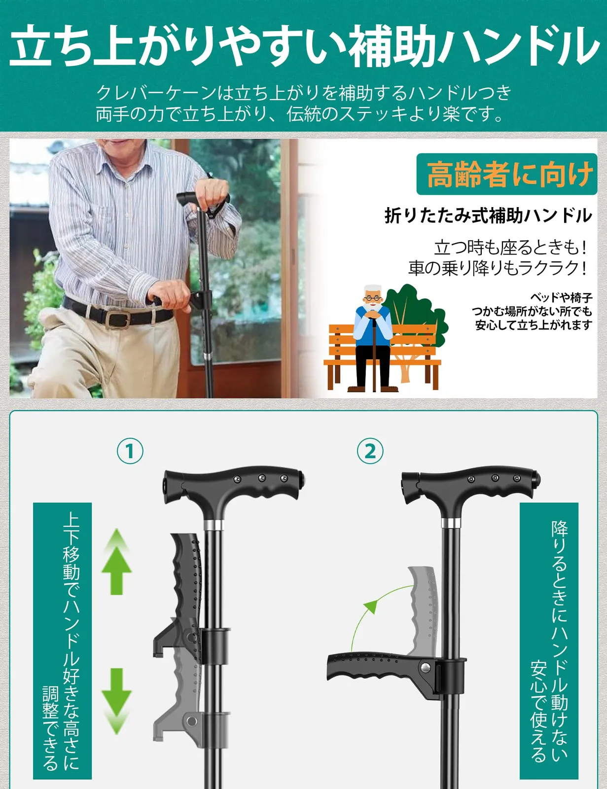 補助ハンドル付き、クレバーケーン:2ハンドルなので体重が左右均等化されて立ち上がる時や座るときにバランスを保つことができ、ベッドや椅子、つかむ場所がない所でも安心して立ち上がれます。握りやすいグリップで、手に負担がかからない、手首に通しておける落下防止用のストラップ付きです。