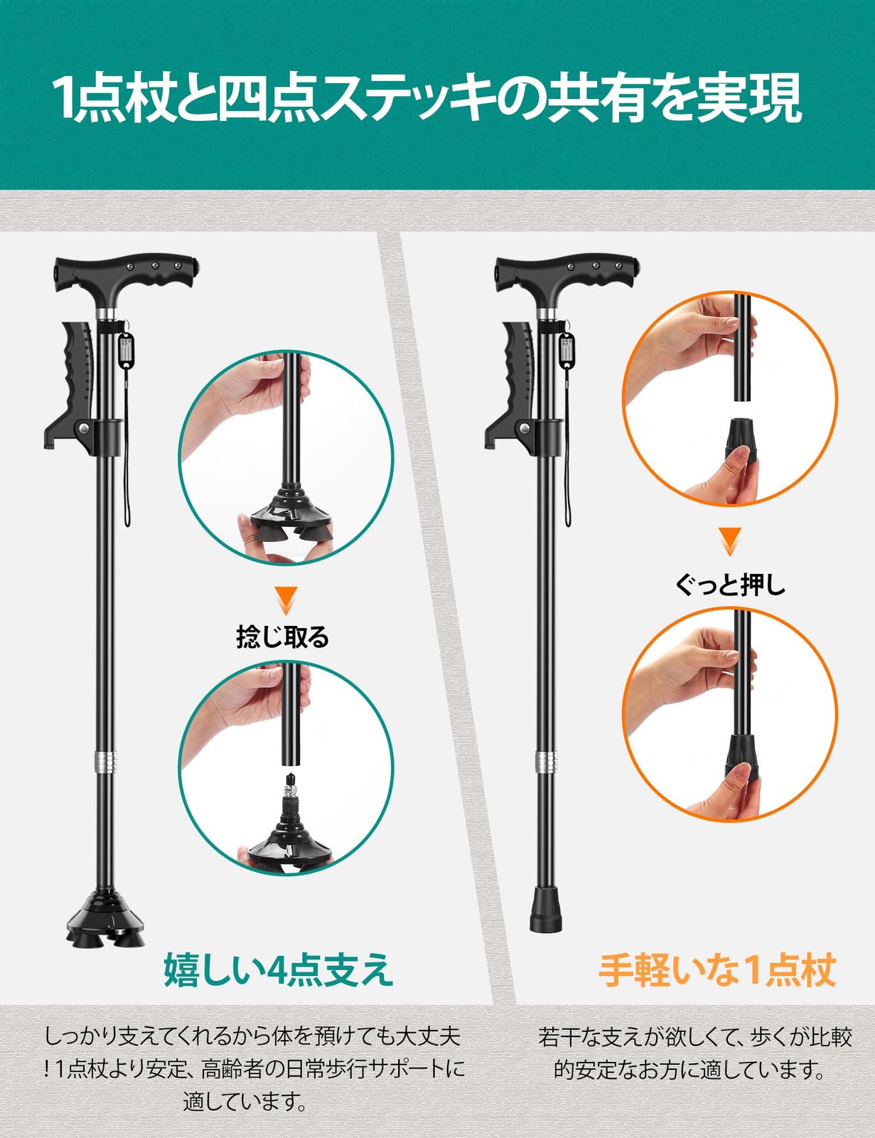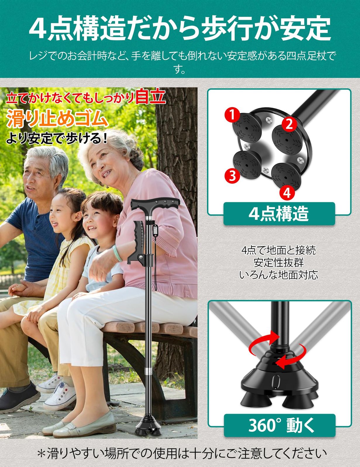 嬉しい4点杖・自立型ステッキ:4点式と滑り止めのゴム脚で接地面をしっかり固定して、1点杖より広い面積でしっかり支えるため安定性抜群です。転びやすい坂道、濡れて滑りやすい階段、小石で不安のある砂利道も自信をもって歩けます。また、自立型ステッキなので、手を離しても倒れないから、レジでのお会計や家の鍵を開けるとき、手を洗うとき、くつを履くときなどに大変便利です。