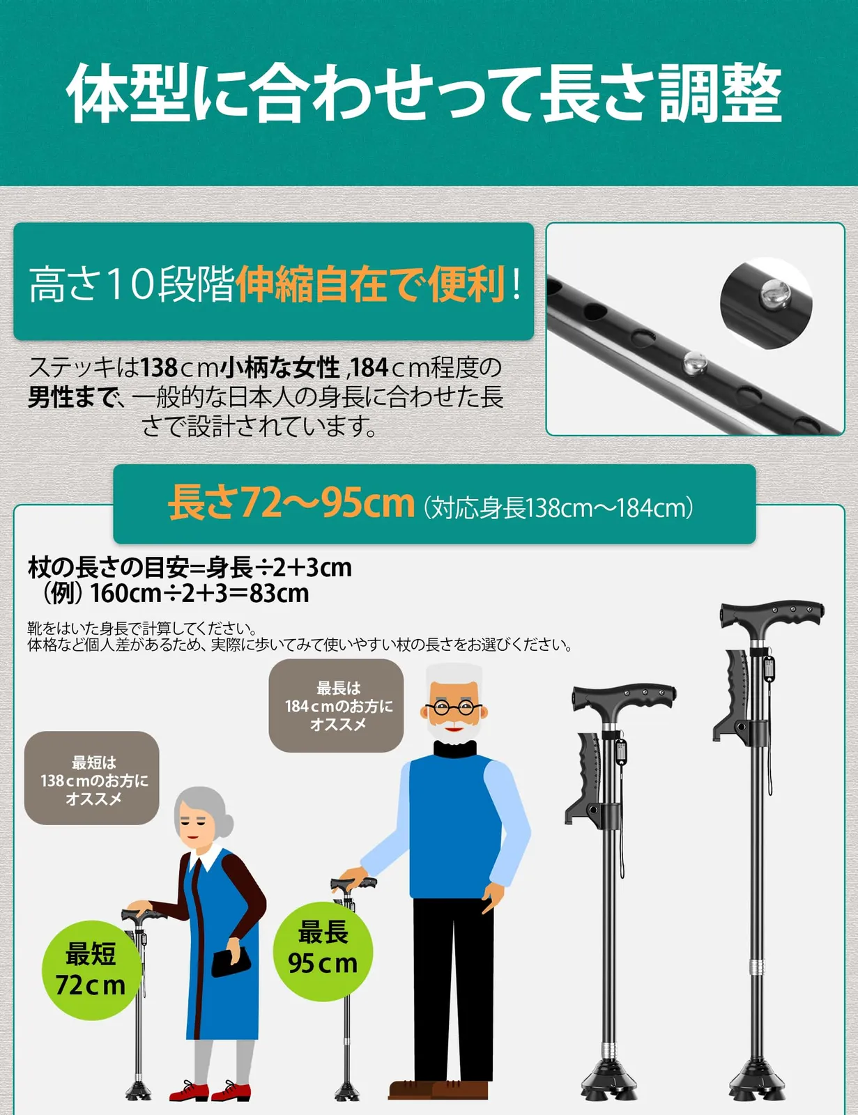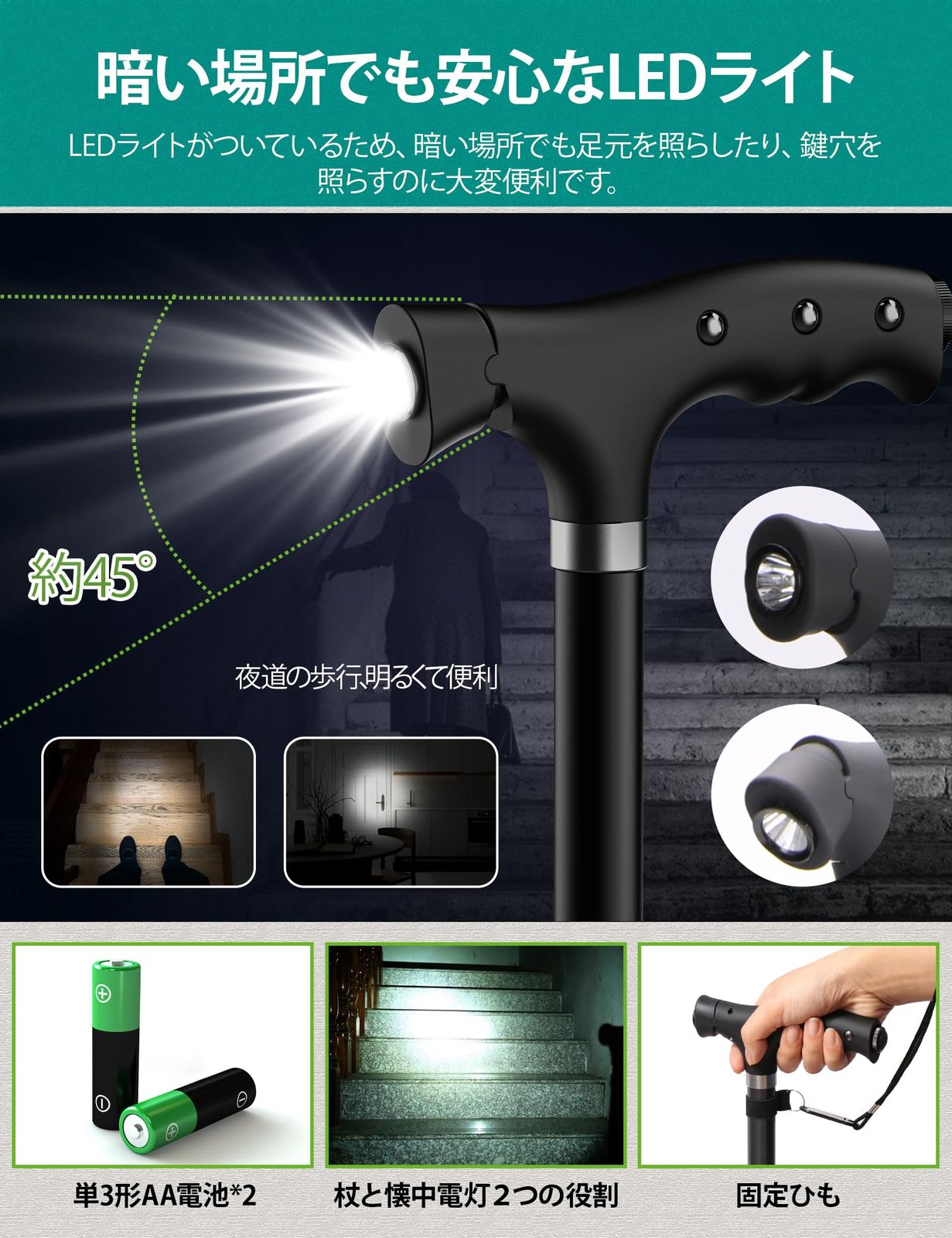 暗い夜道を照らす、LED伸縮式歩き杖:LEDライトがついているから薄暗い夜道や夜のトイレでも明るく道を照らしてくれます。杖の長さは72~95cmまで調整可能、黒と赤二色の選択もあり、身長138~185センチの紳士と女性に適しています。また、アルミニウム合金製の軽量タイプで、丈夫で長持ちし、高齢者が持ってもそれほど負担になりませんですのため、日常散歩、旅行、介護補助などに大活躍です。