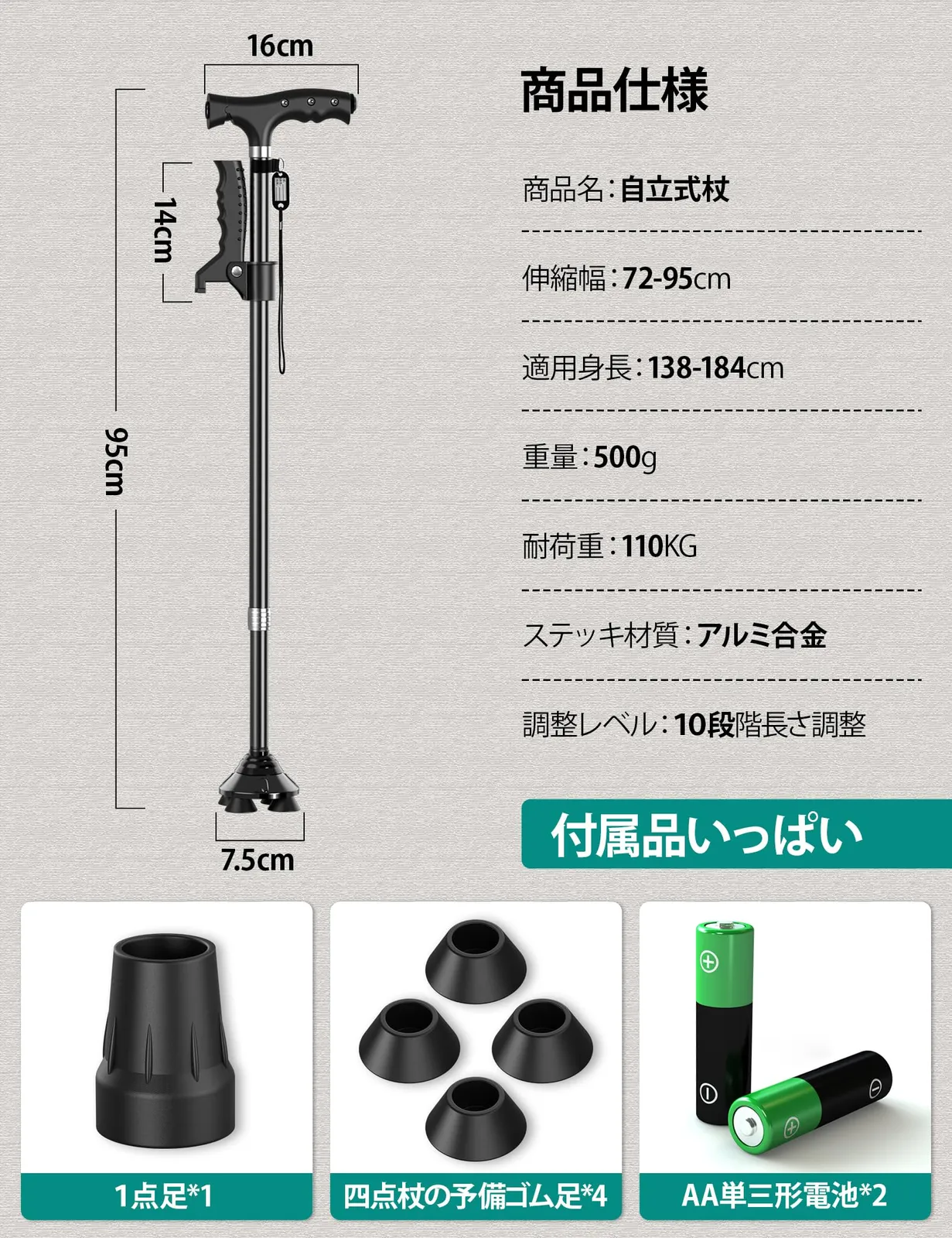 【パッケージ】折りたたみ杖x1、電池x2、日本語説明書x1 。期間内に万が一問題がありましたら、ご遠慮なく当社まで連絡してください。