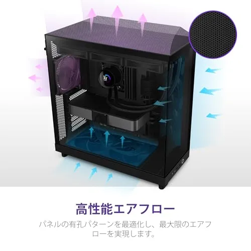 標準付属の120mmファンx3基から熱を発しやすいコンポーネントにエアフローを供給します。リアの排気と、ボトムに140mmファン(別売)を2基とりつけることでが上に向かって排気するエアフローを構築できます。
