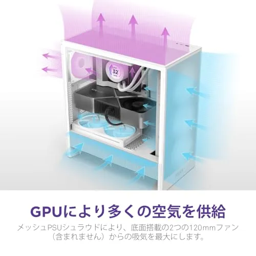 全面メッシュ構造のPSUカバーとメッシュパネルにより、エアフローを最大限に高め、GPU冷却を効率化。過熱を防ぎ、システムのパフォーマンスを維持します。