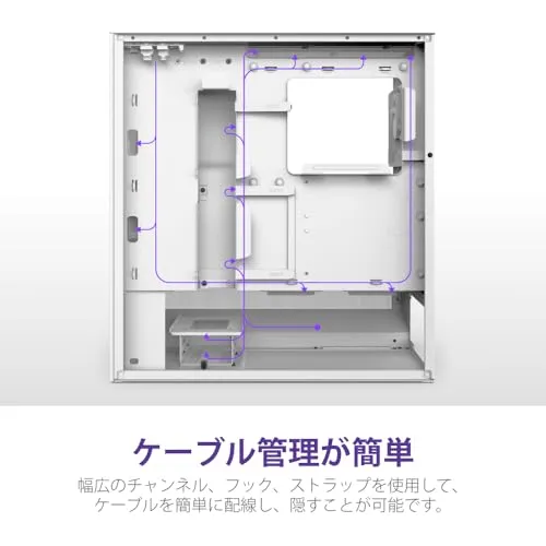 最大8台のファンを搭載可能で、柔軟な冷却構成を実現します。E-ATX(最大277mm)、ATX、Micro-ATX、およびMini-ITXマザーボードに対応し、様々なビルドに対応できます。