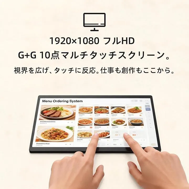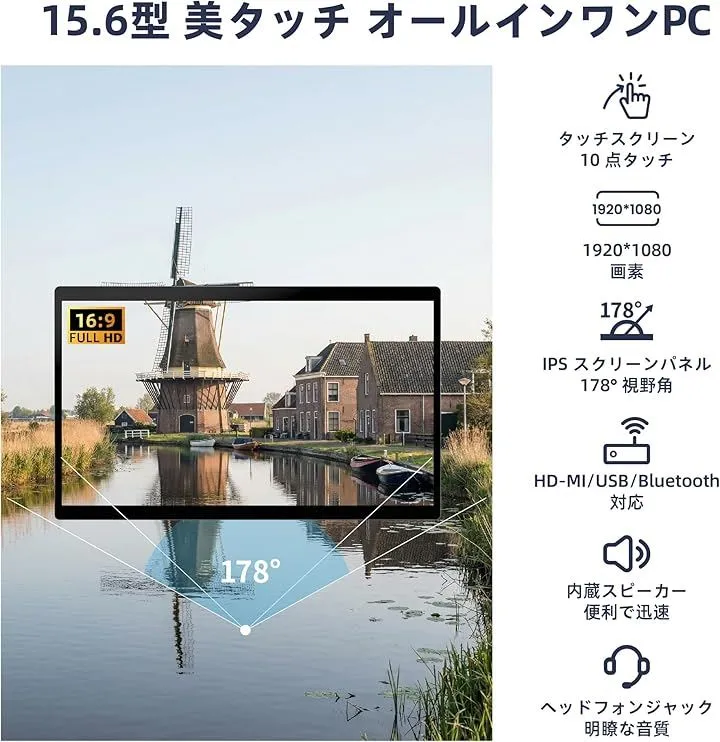 「15.6型大画面タッチ操作」15.6インチの広視野角IPS液晶タッチスクリーン(1920x1080)。