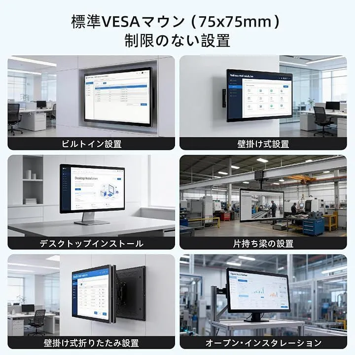 スタンド、壁掛け、アーム取り付けなど、多様な設置方法を選べるため、店舗、工場、教室など、あらゆるシーンで柔軟に活用できます。