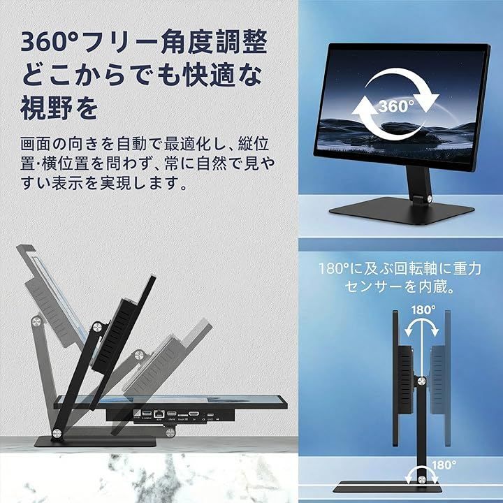 「360°回転スタンドで視点を自在に」専用の頑丈な360°回転スタンドを装備。