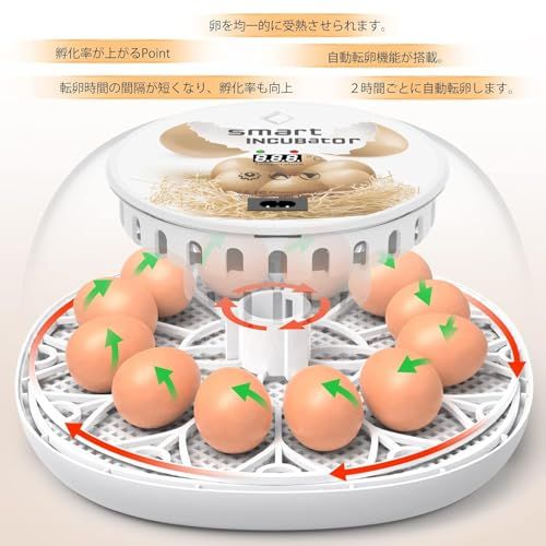 【大容量&多種類な孵化】毎回12個ニワトリサイズの卵を孵化できる大容量な全自動孵卵器です。ニワトリ12個、ウズラ卵、すずめ卵2436個など様々な種卵に対応できます。いろんな種卵の孵卵にチャレンジできます。種卵の大きさによって、可能な孵化の数も違っています。