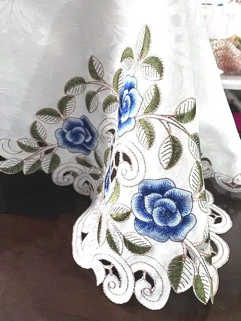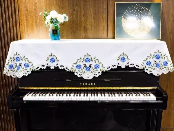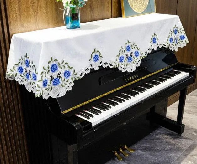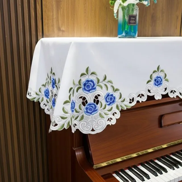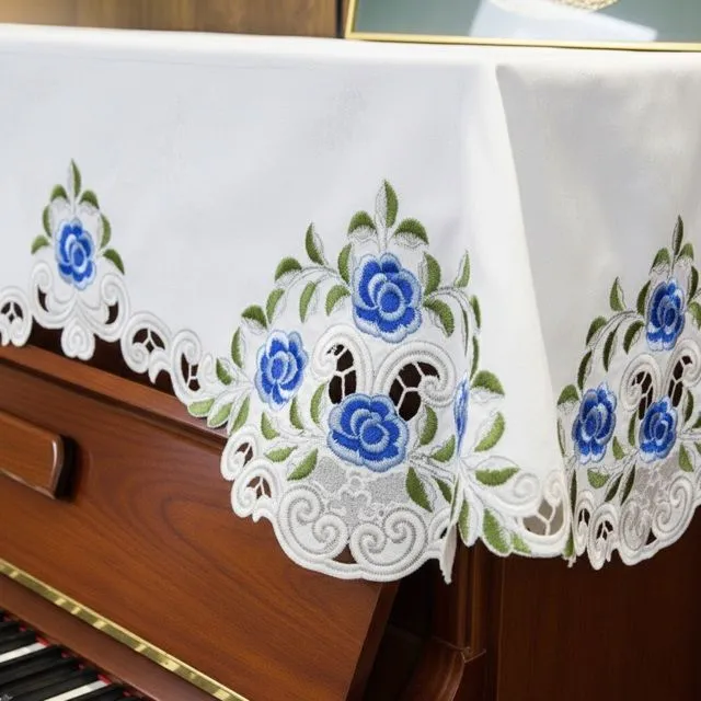 アップライトピアノカバー 80X210cm ホワイト地に青い薔薇刺繍クラシックな雰囲気