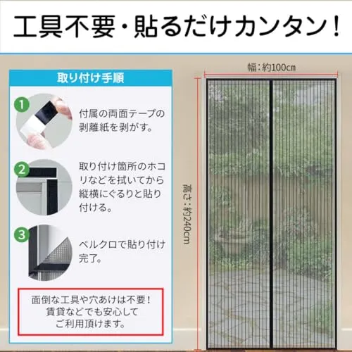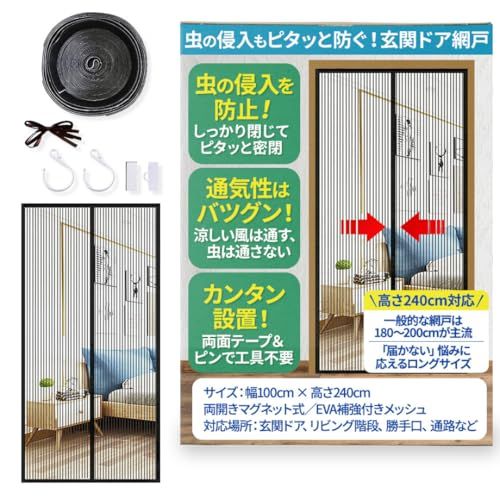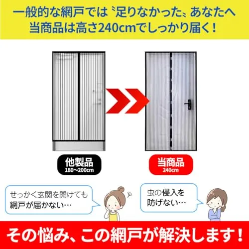 240cmのロングサイズで大型ドアに対応。近年増加しているハイタイプの玄関や階段の出入口にもフィットする、高さ240cmのマグネット式網戸。従来の180200cmでは足りなかった方にぴったりです。