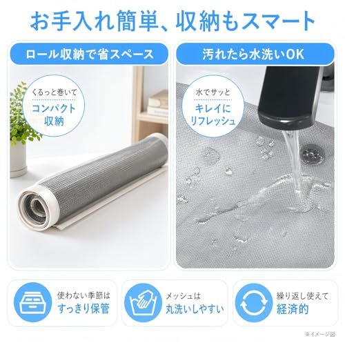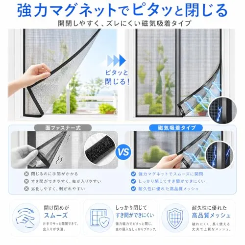 【簡単に取り外し可能】マグネット式なので、取り付けだけでなく取り外しも非常に簡単です。掃除をする際や使用しない時はすぐに外すことができ、粘着テープの痕が残りにくく、キレイに剥がせます。もし痕が気になる場合は、施工前にマスキングテープを窓枠に貼っておくとさらに安心です。