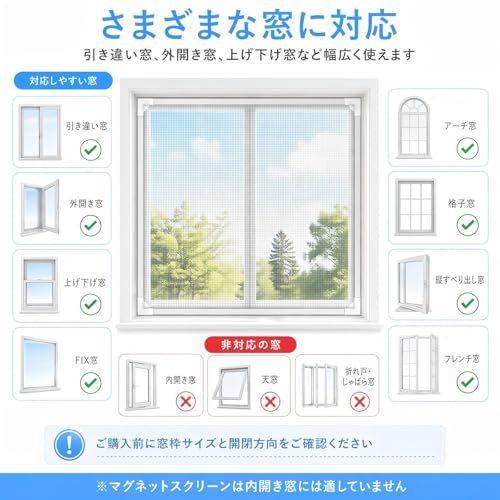 【美しいデザイン】シンプルで清潔感のあるホワイトカラーのデザインは、どんな窓枠にも自然に調和し、インテリアを損なうことなく美しく仕上がります。網戸のネットはグレーで、視界を遮ることなく室内の明るさを保ちながら、プライバシーも守ります。網戸の枠はしっかりとした厚みがあり、巻き癖が付きにくいため、取り付け後に外れる心配がありません。