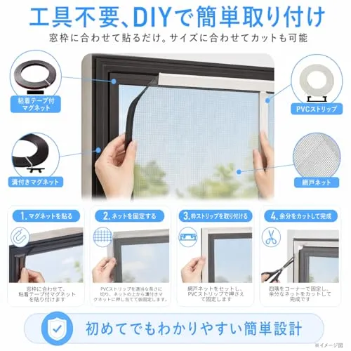 【簡単取り付けの網戸キット】Serenesolのマグネット式DIY網戸キットは、特別な工具や複雑な手順を必要とせず、付属のわかりやすい日本語の取扱説明書に従って、誰でも簡単に取り付けられます。マグネットによる強力な固定力で、小さな窓にぴったりフィットし、手軽に網戸を取り付けることができます。