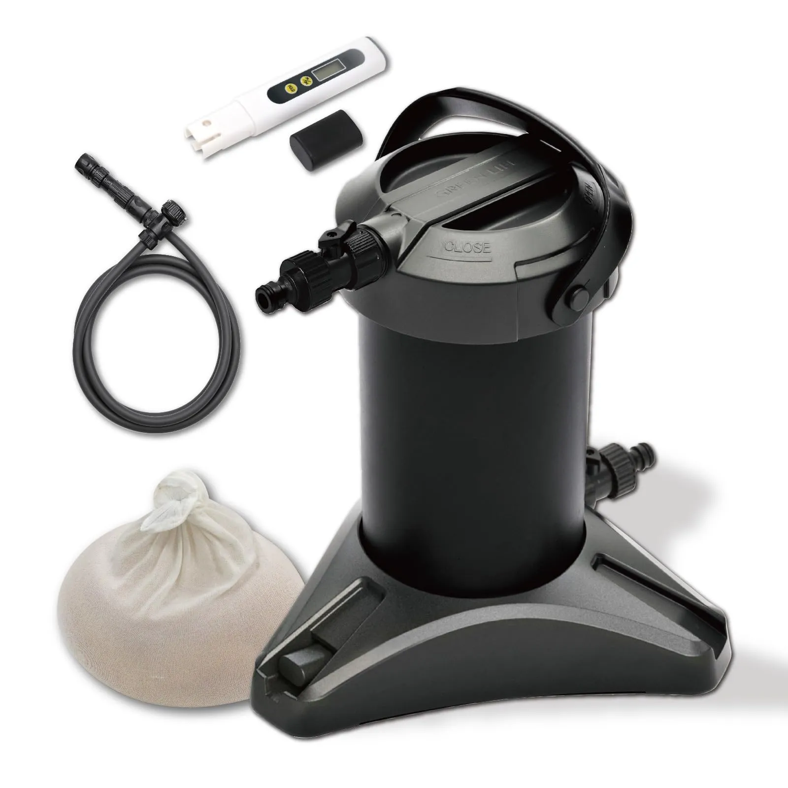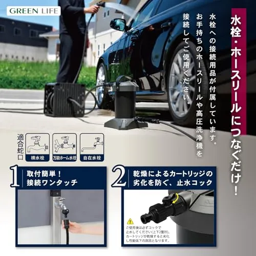 【使用方法】付属の補助ホースで蛇口と純水器本体を繋ぎます。純水器の先にお手持ちのホースリールや高圧洗浄機を繋ぎます。(コネクターでワンタッチ接続可能。)付属のTDSメーターで純水であることを確認し、ご使用ください。