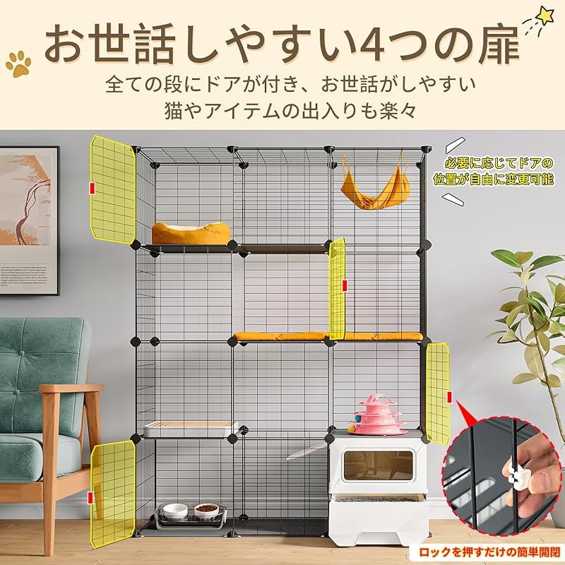 【3段猫用ケージ】サイズは高さ143×幅107×奥行き45cm、多頭飼いにも対応できる3段タイプ猫 ケージです。各段に棚板が付いており、自由に上り下りし、猫ちゃんの運動不足やストレスを解消してくれます。扉が4枚付いており、猫やおもちゃの出入りは簡単、ケージ内のお掃除も楽にできます。ドアロックが簡単に開閉できますが、ペットは中から開けられなく、脱走を効果的に防ぎます。