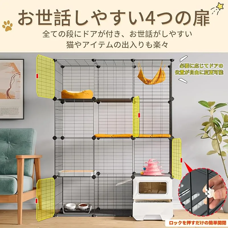 【自由に組替え】組み立て式のキャットケージですので、ケージの形や大きさが必要に応じて組替えが行われます。トイレの位置や扉の開く向きも変更することもできます。