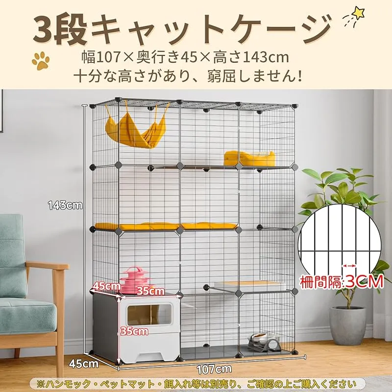 商品名:Topzoo 猫 ケージ トイレ付き 高さ143×幅107×奥行き45cm トイレ一体型 防臭 飛散軽減 3段 引き出し スコップ付き 掃除しやすい キャットケージ 組立簡単 猫用ケージ 大型 幅広 多頭飼い 脱走防止 コンパクト 子猫 保護用 室内用 日本語