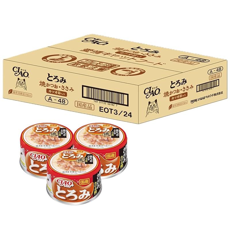 【商品詳細】 ブランド:チャオ (CIAO) 商品種別:缶詰キャットフード 商品名:チャオ (CIAO) とろみ 焼かつお ささみ カツオ節入り 80g×24個 (セット) 猫用 ウェットフード 缶 製造元:いなばペットフード 発売日:2024年03月08日
