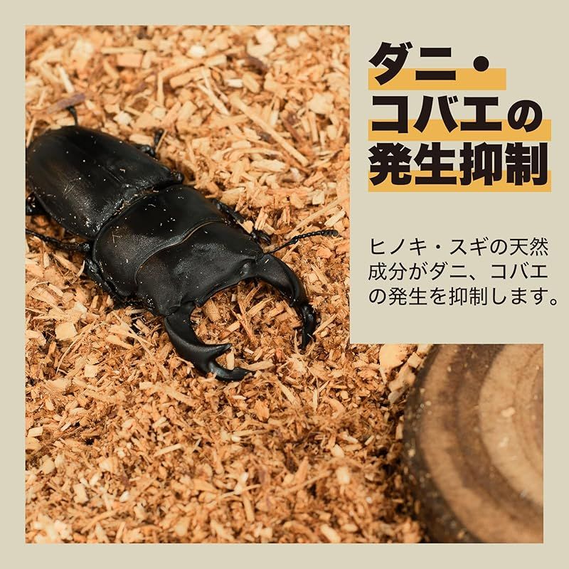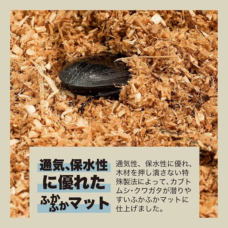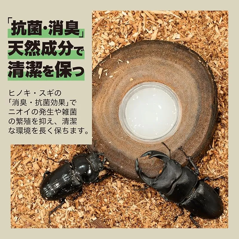 木材本来のやわらかさを損なわない特殊製法を施し、過度な粉砕や圧縮を避けて自然な質感を保持。 ふわっと軽く柔らかいおがくずチップに仕上がり、昆虫が歩きやすく、かつ潜りやすい床材を実現。 粒形状の工夫により通気性と保水性のバランスに優れ、乾燥しすぎず蒸れにくい快適な飼育環境を維持します。