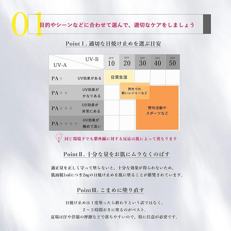 【商品概要】 UVカットと下地効果でお肌をカバー SPF 50 「PA++++」の紫外線カット効果によりお肌を紫外線のダメージから守ってくれます。化粧下地としての効果もあり、ファンデーションなどのもちを良くしてくれます。
