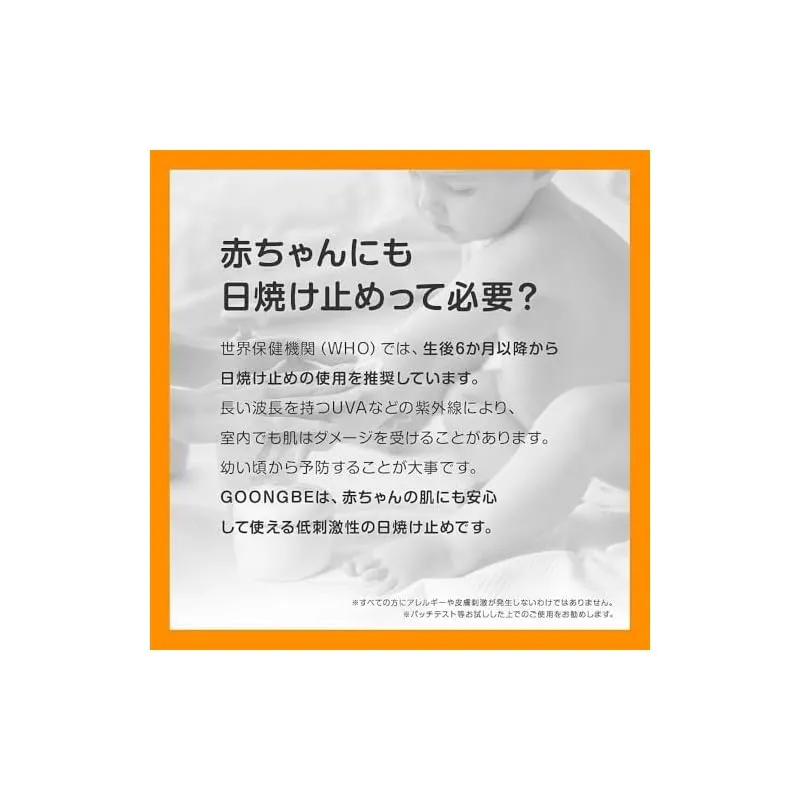 【生後6ヶ月ごろ~】世界保健機関(WHO)では、生後6ヶ月ごろから日焼け止めの使用を推奨しています。GOONGBEは赤ちゃんの肌にも安心して使える低刺激の日焼け止めです。※すべての方にアレルギーや皮膚刺激が発生しないわけではありません。パッチテスト等お試ししたうえでのご使用をお勧めします。