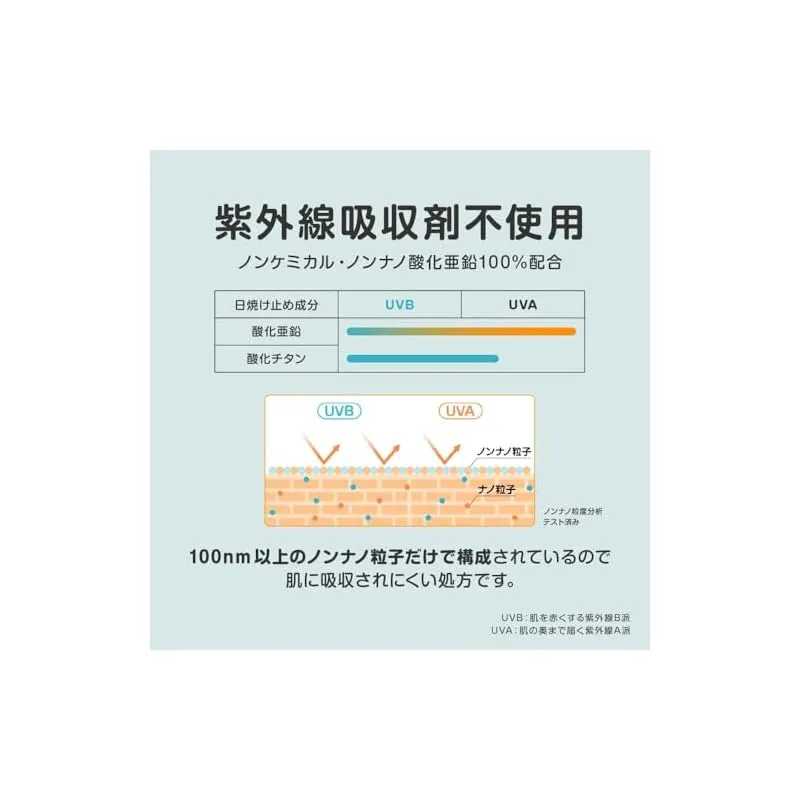 【ノンケミカル・ノンナノ処方】紫外線吸収剤不使用の肌に優しい日焼け止めです(ノンナノ酸化亜鉛100%配合)。