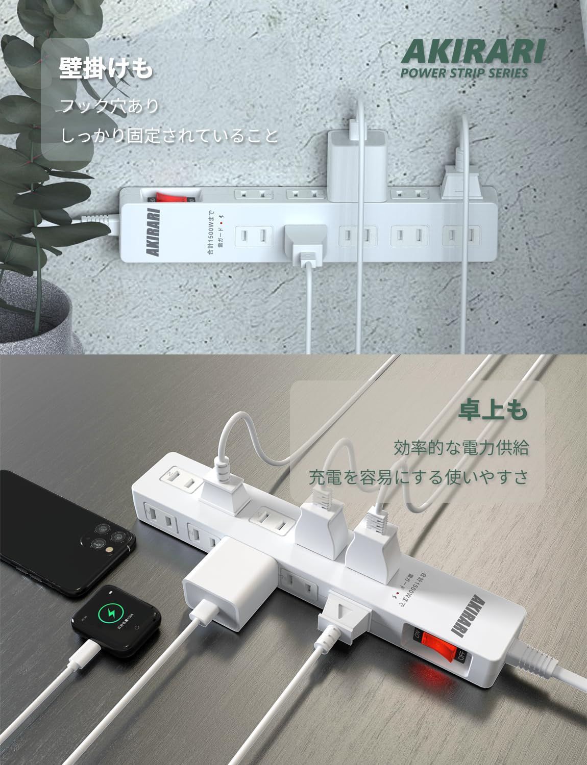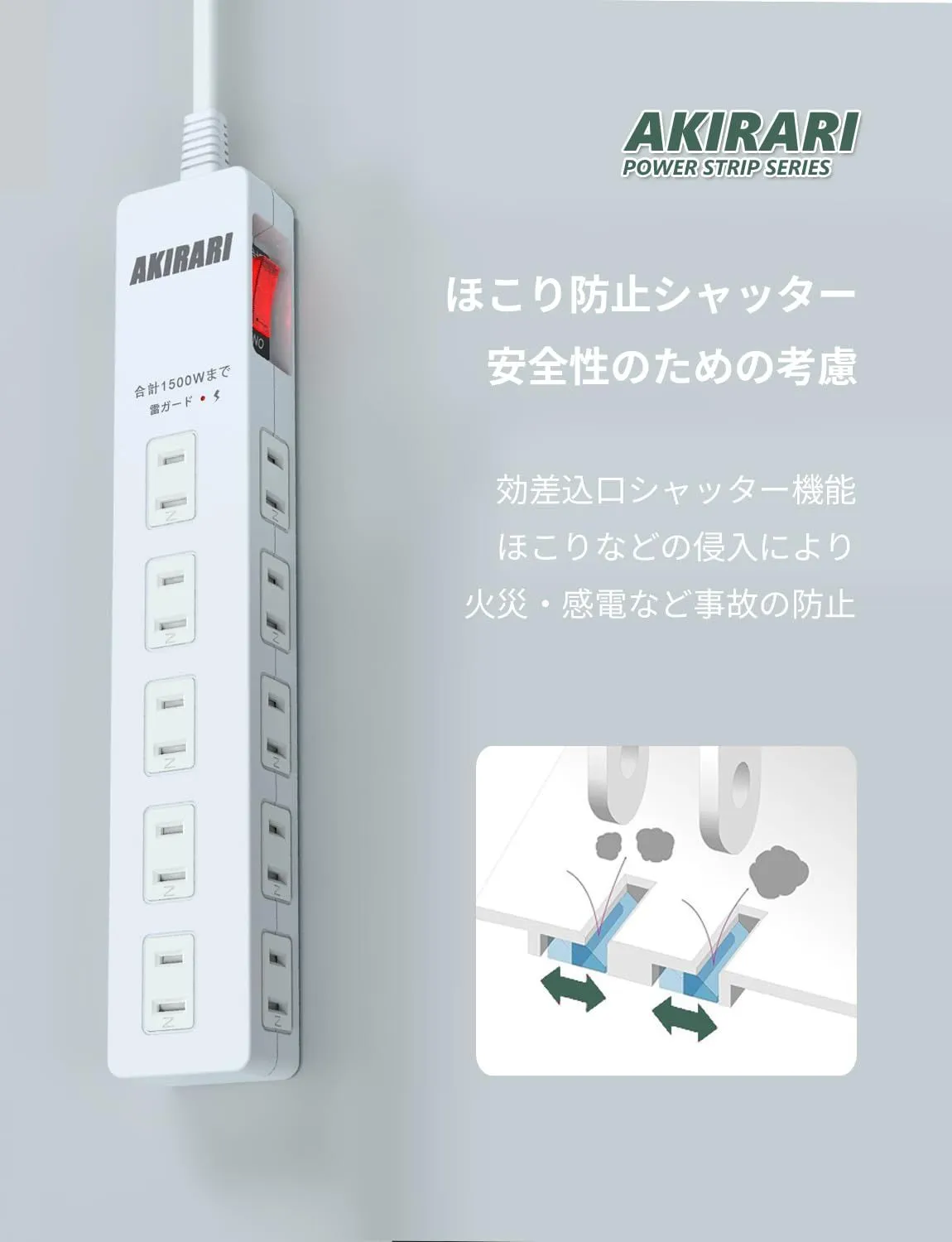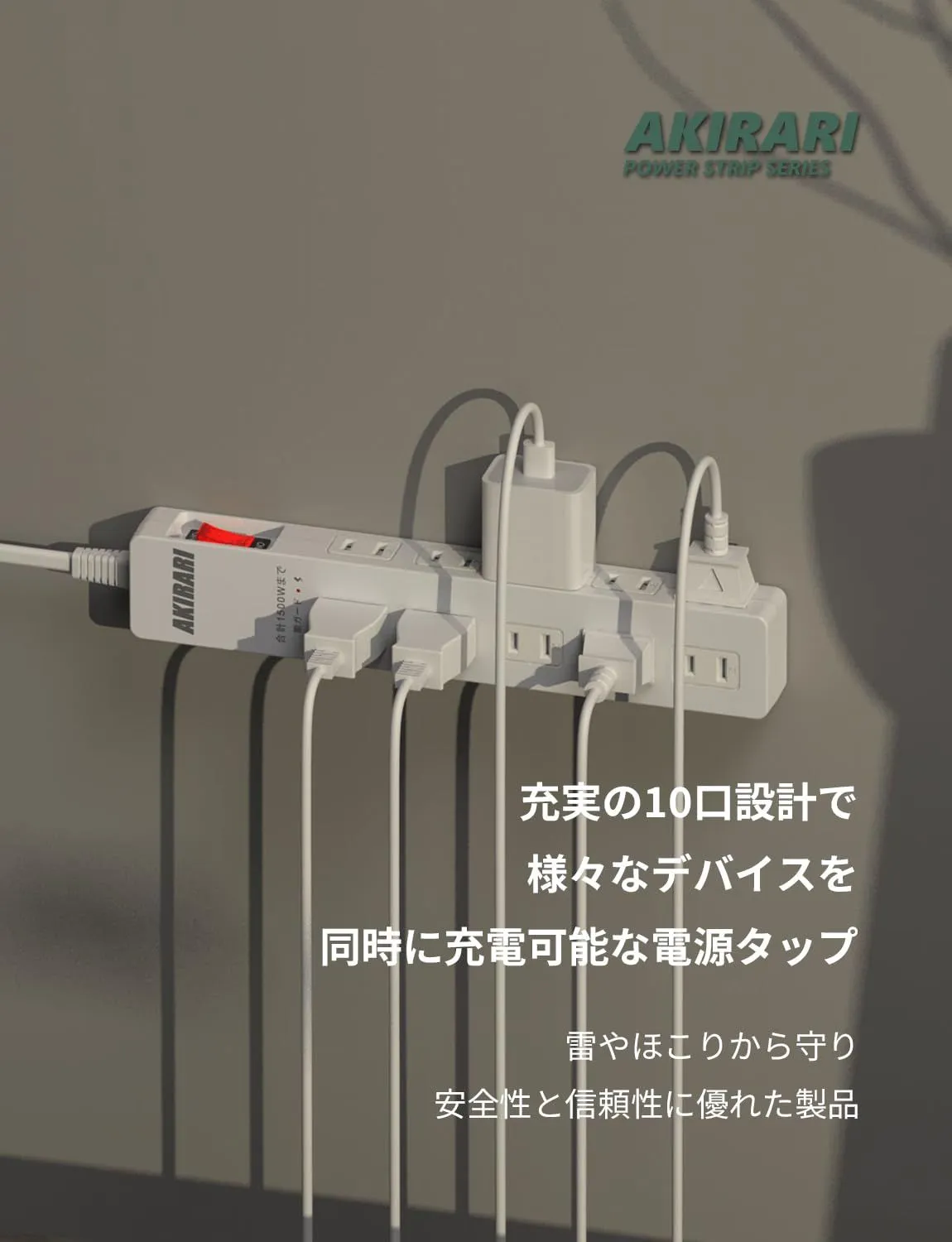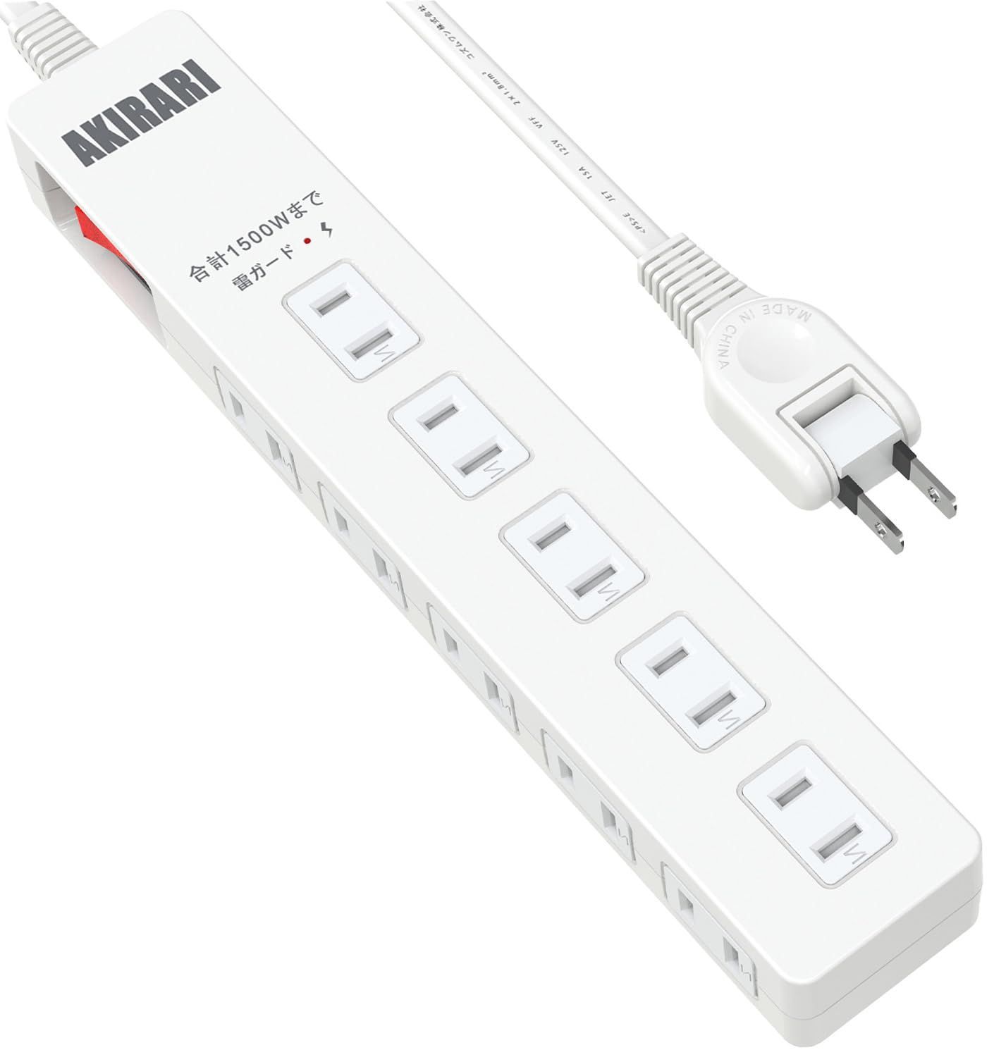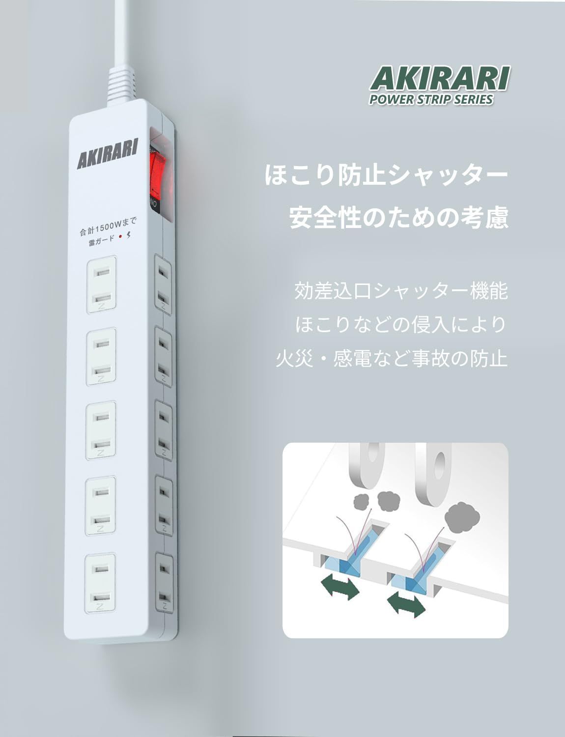 AKIRARI 電源タップ 10個口 ホワイト コンセント 電源コンセント 雷ガード 防塵 防雷 ほこり防止シャッター付き ホコリ対策 スイッチ タコ足 コンセントタップ スイングプラグ 節電 PSE認定 (ホワイト)