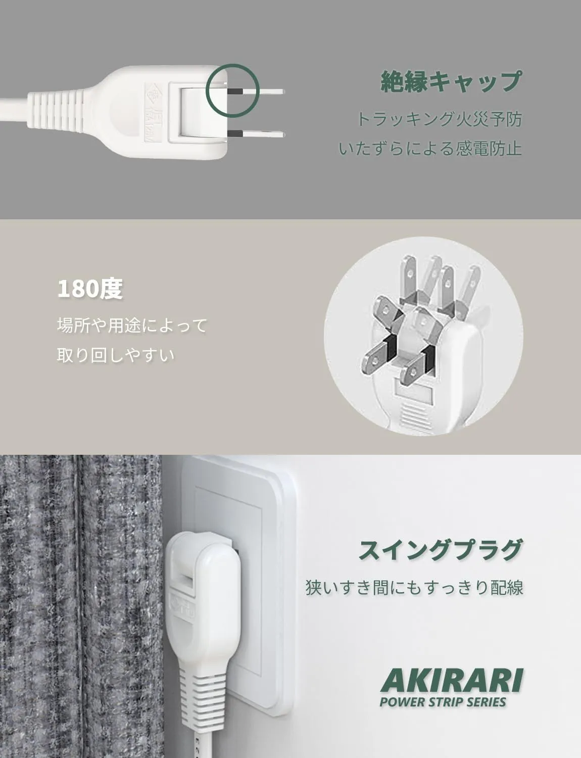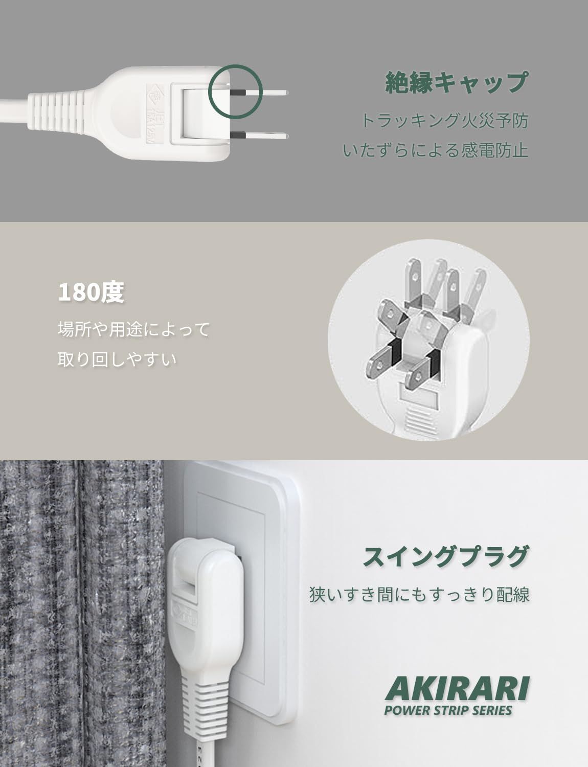 【180度スイングプラグ】 狭いすき間にもすっきり配線 耐火性に優れたユリア樹脂を使用。フック穴あり 壁にかける時にしっかり固定されていることを確かめてからご使用ください。