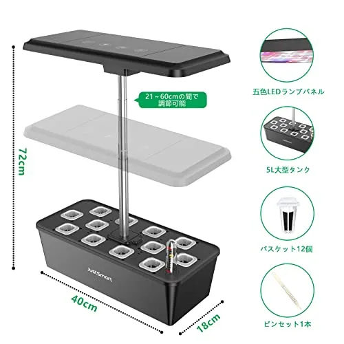 5Lタンク:独立した5Lタンクは、植物の成長を12週間サポートします。可視窓は水槽の水の量を見ることができる。より美しく設計された隠し線と、水不足による機器の損傷を防止するためのドライウォーターウォータポンプを備えています。注意:植物の成長には、栄養液が欠かせません。(種と栄養液はご自身で購入する必要が あります)栽培の種類に応じて適切な養液を購入し、指示に従って適度に添加して ください。適格請求書を発行できますので、必要がありましたら、メールでご連絡ください。