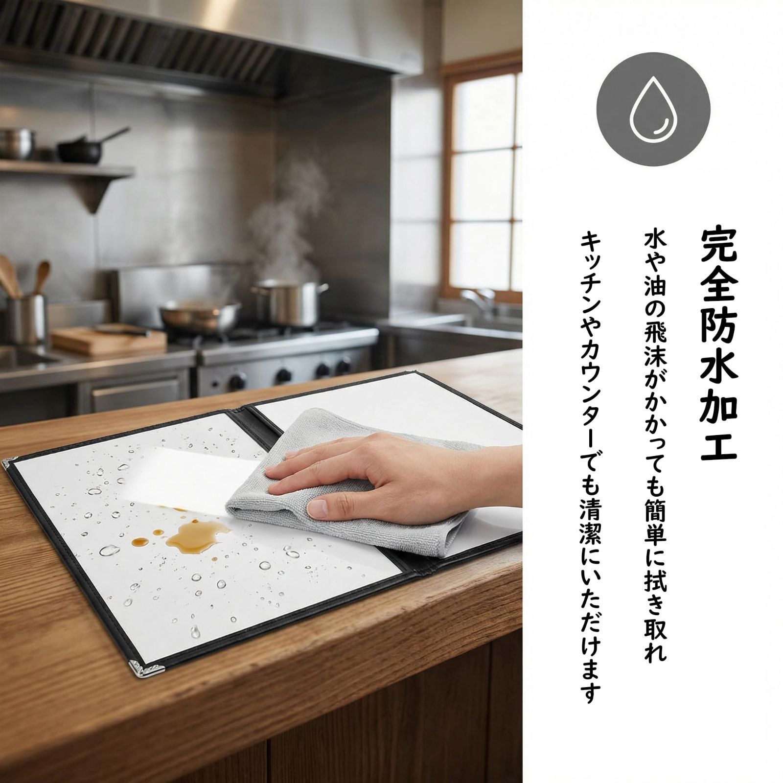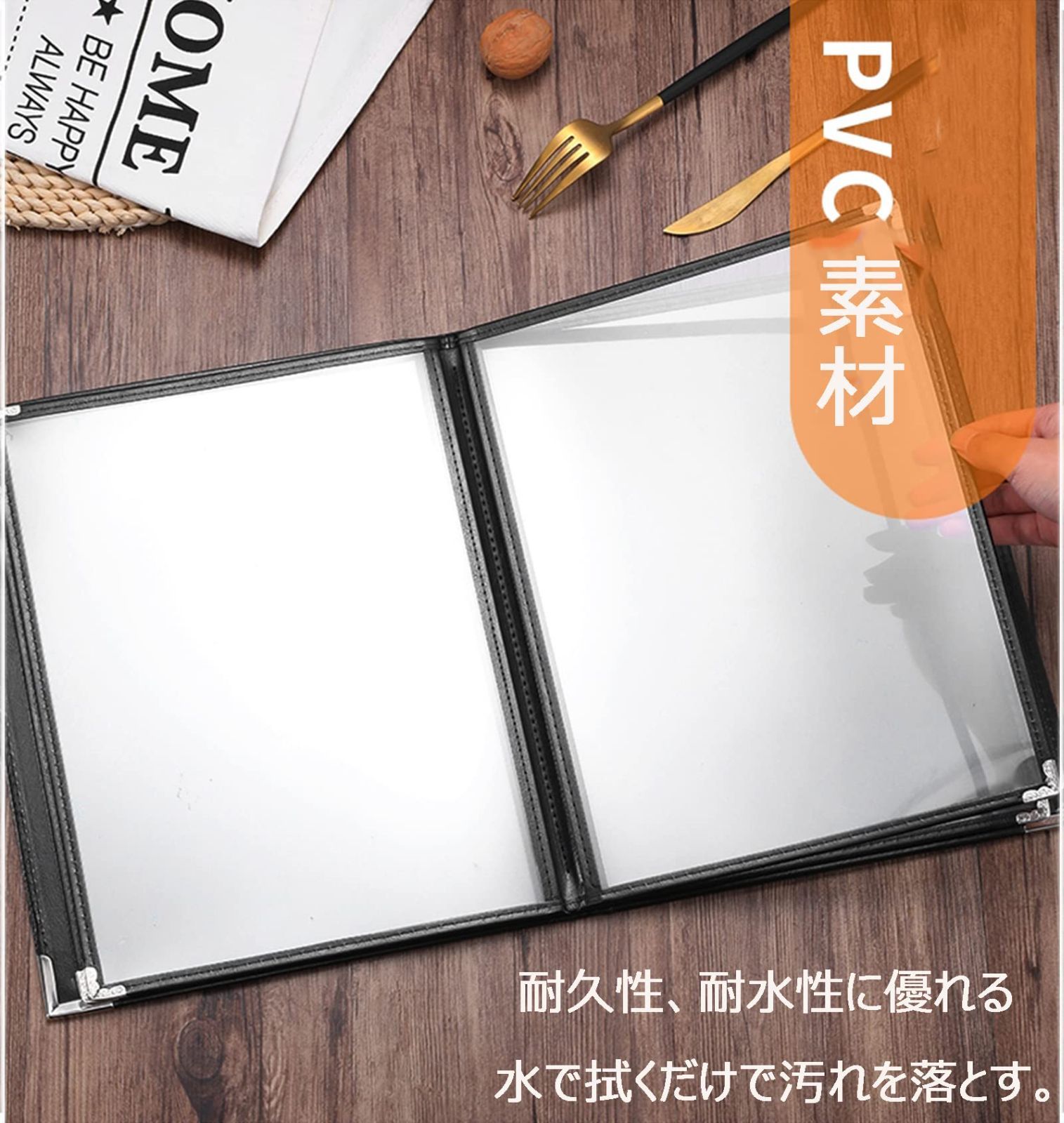 a4 メニューブックがPVC素材を作られ、耐久性、耐水性に優れます。洗剤を使わずに水で拭くだけで汚れを落とす。
