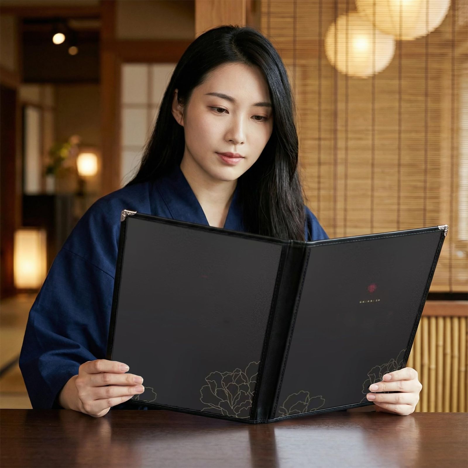 優れるPU革を使用したシンプルなデザイン、重厚な高級感が溢れます。黒色のメニューファイルはいろんな場面で重宝します。