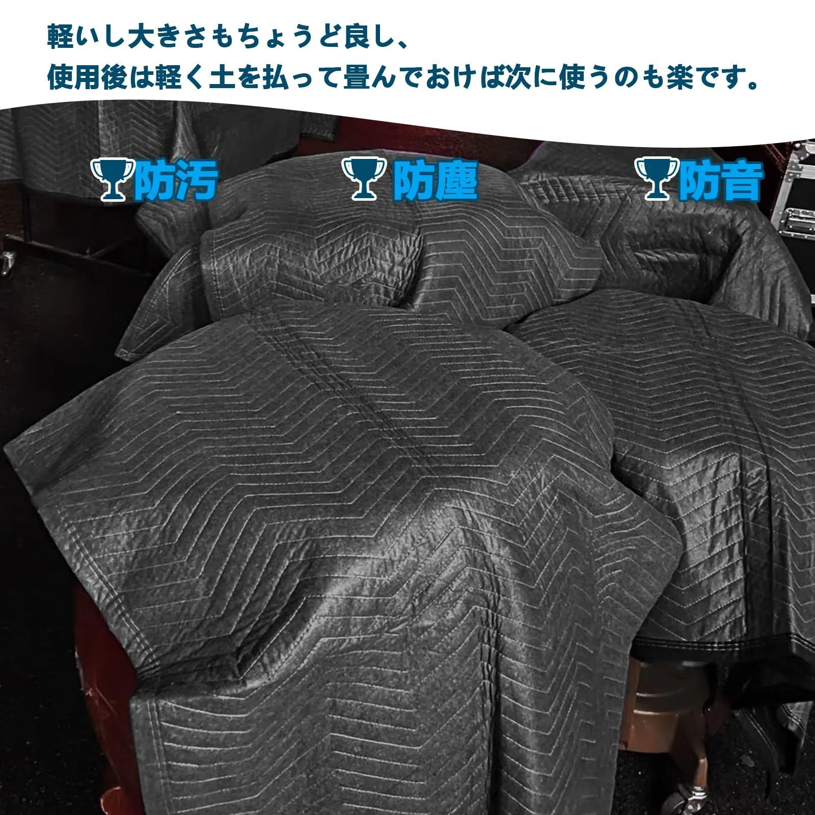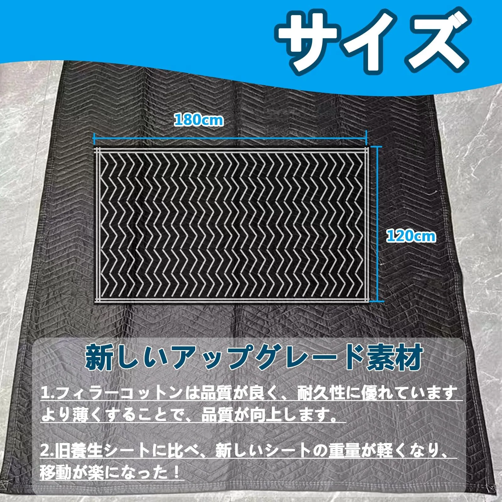 【商品仕様】養生クッションマットの素材:ポリエステル+綿。サイズ:180x120cm、重さ:0.9kg/枚、サイズと適度な厚さがあり、持ち運びも軽く、使いやすいです。