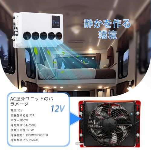 【高効率省エネ】この12Vエアコンは高効率コンプレッサーと厚化アルミ製冷却器を採用し、スマートインバータ技術と組み合わせることで、高効率かつ省エネの冷却効果を実現しています。耐用年数が長く、インテリジェント温度制御、低騒音、バッテリー駆動、燃料節約機能を備えています。エンジン停止状態でも低騒音で作動します。